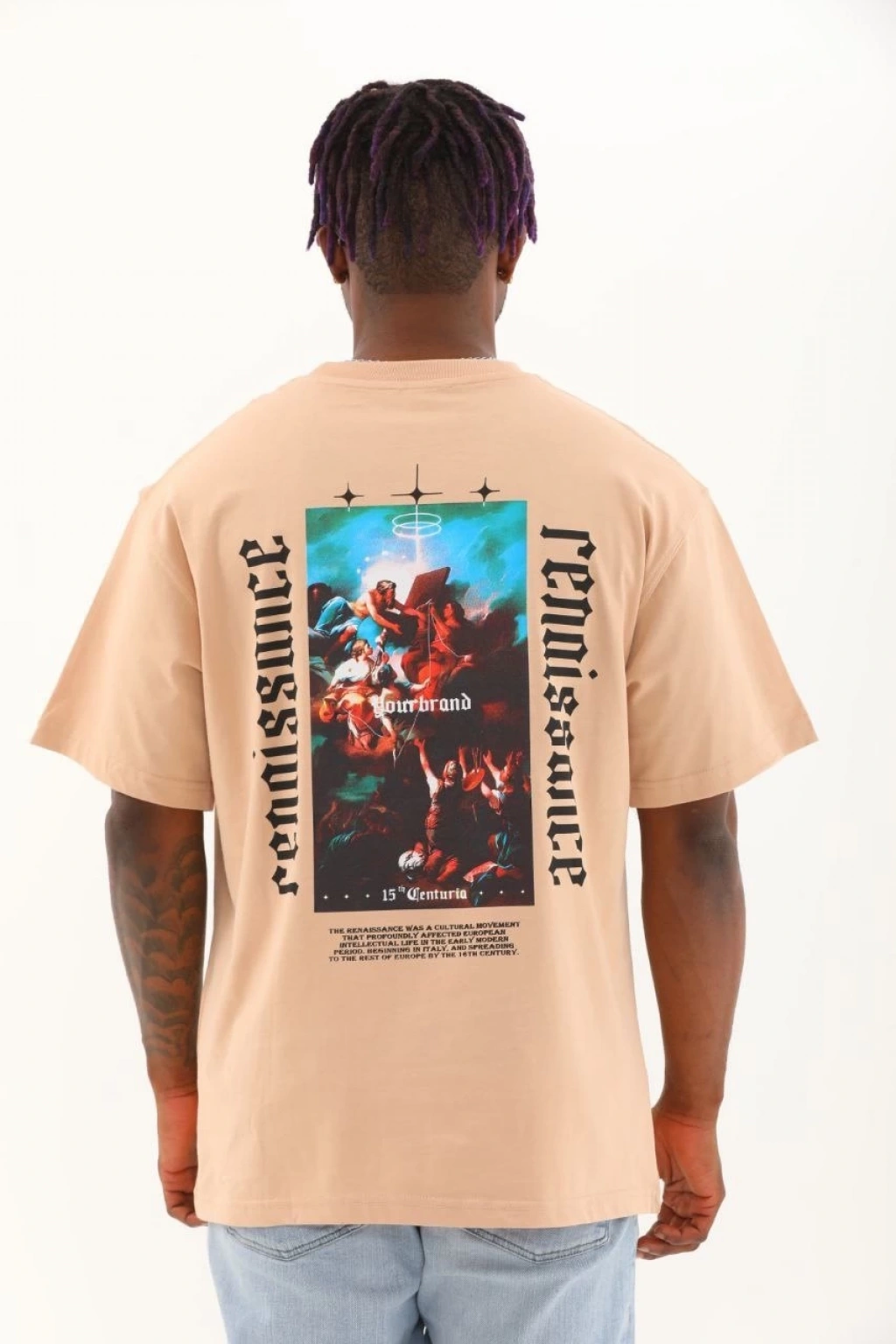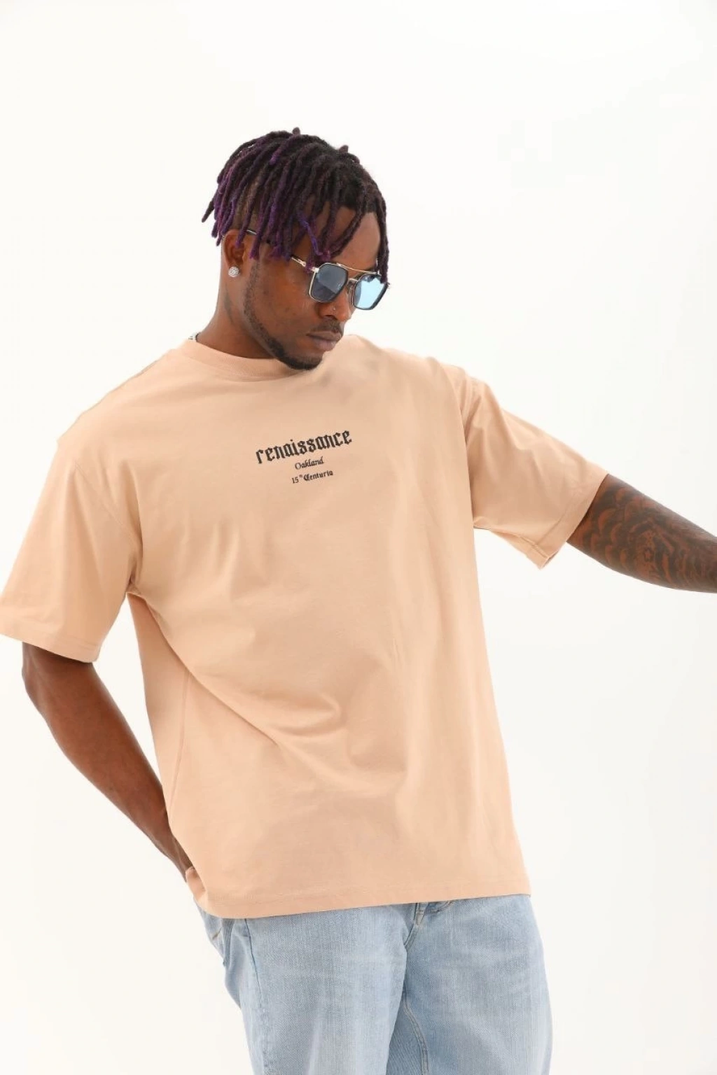 Unisex Oversize Baskılı Bisiklet Yaka T-Shirt - Bej