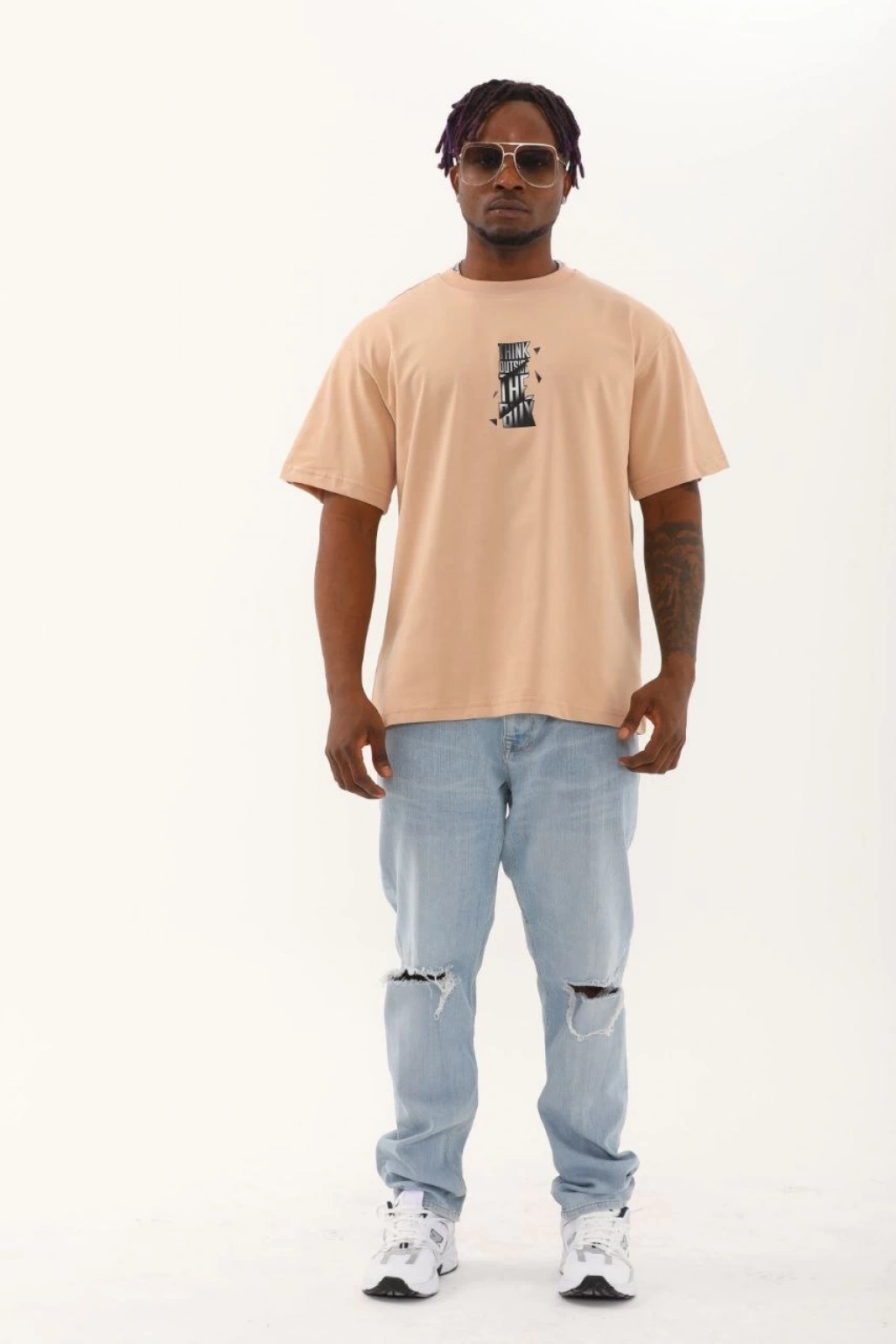 Unisex Oversize Baskılı Bisiklet Yaka T-shirt - Bej