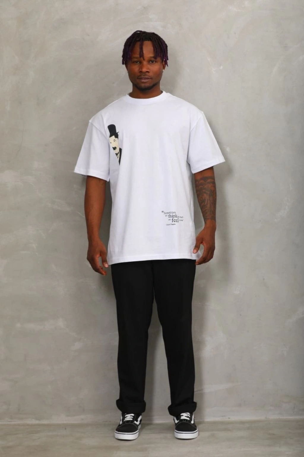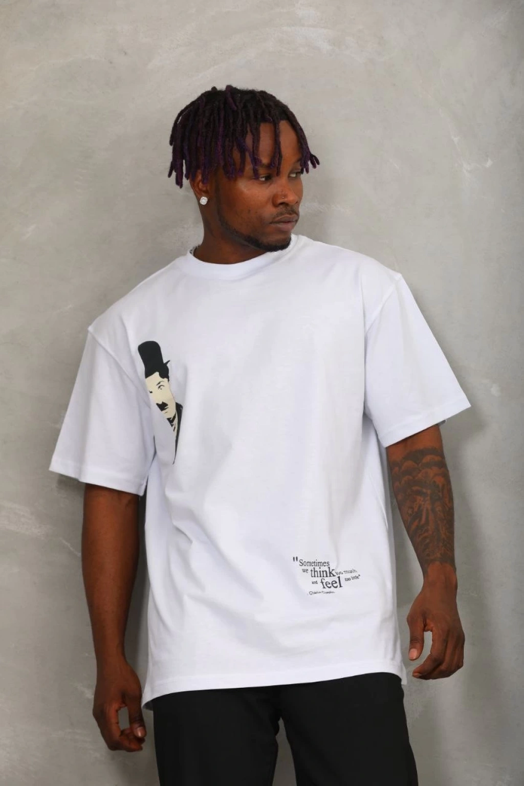 Unisex Oversize Baskılı Bisiklet Yaka T-Shirt - Beyaz