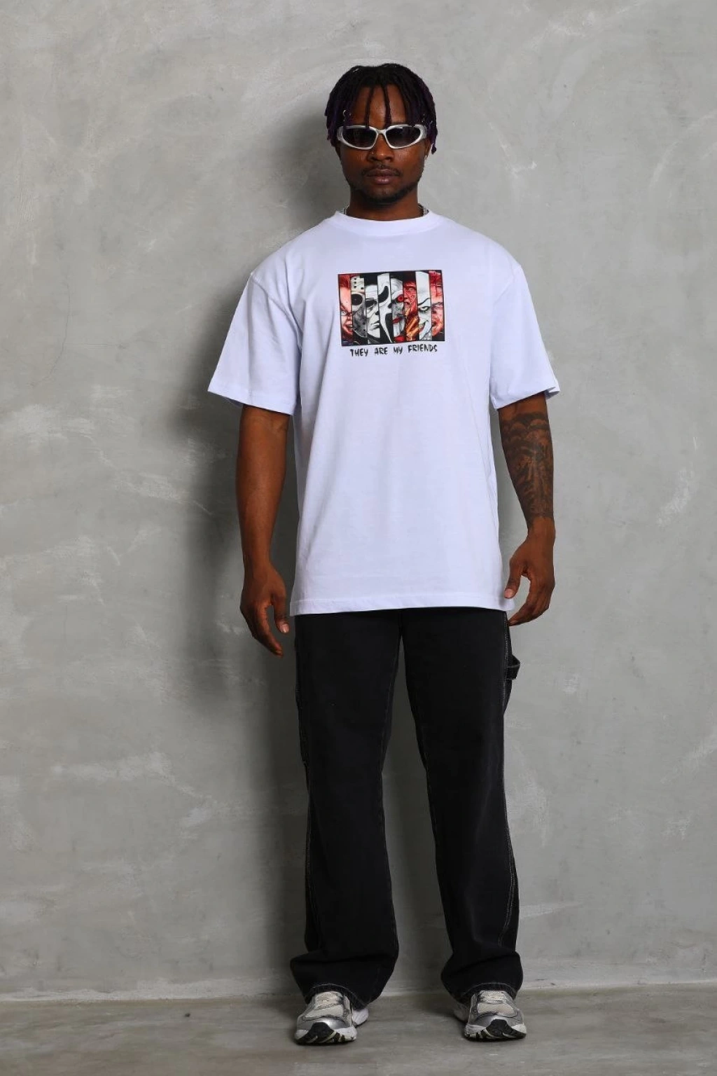 Unisex Oversize Baskılı Bisiklet Yaka T-shirt - Beyaz