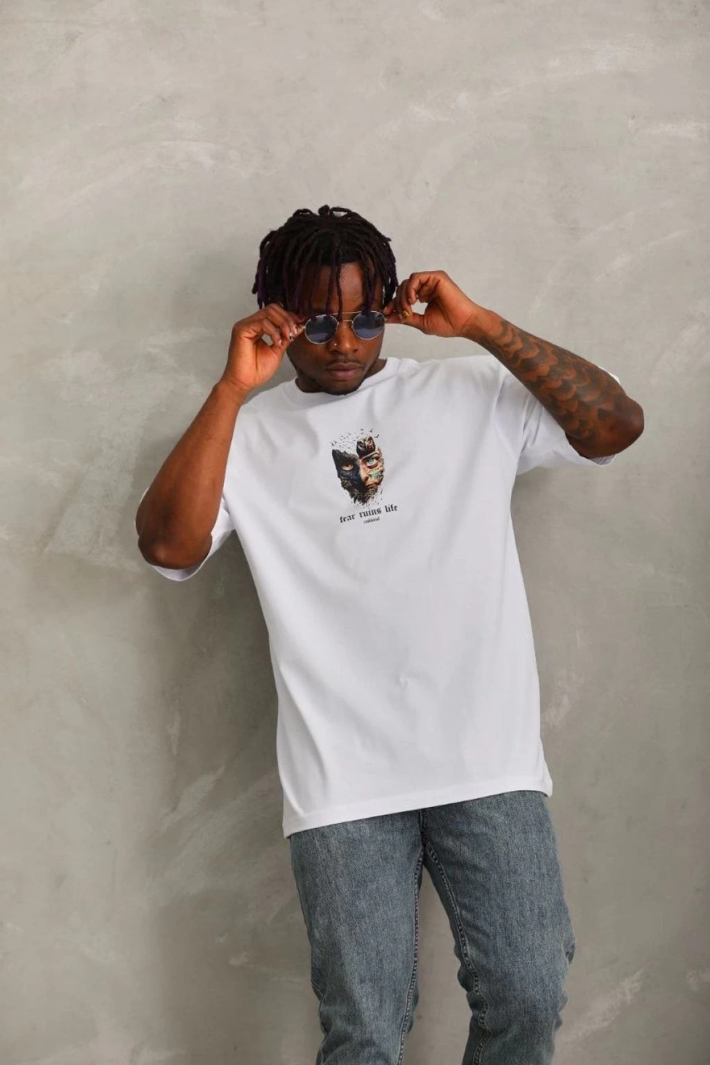Unisex Oversize Baskılı Bisiklet Yaka T-Shirt - Beyaz