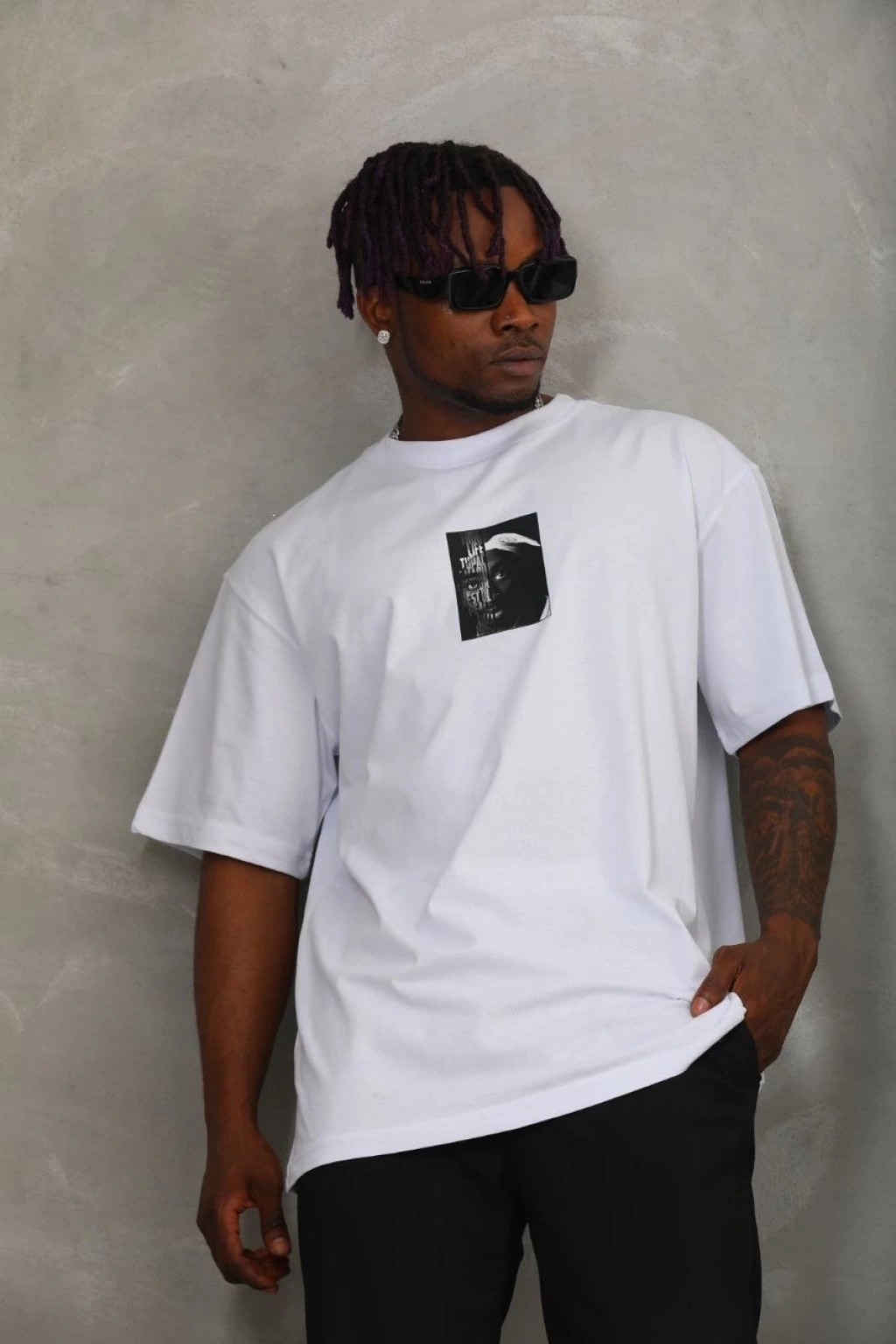 Unisex Oversize Baskılı Bisiklet Yaka T-Shirt - Beyaz