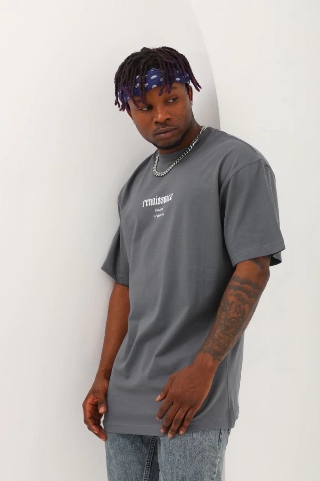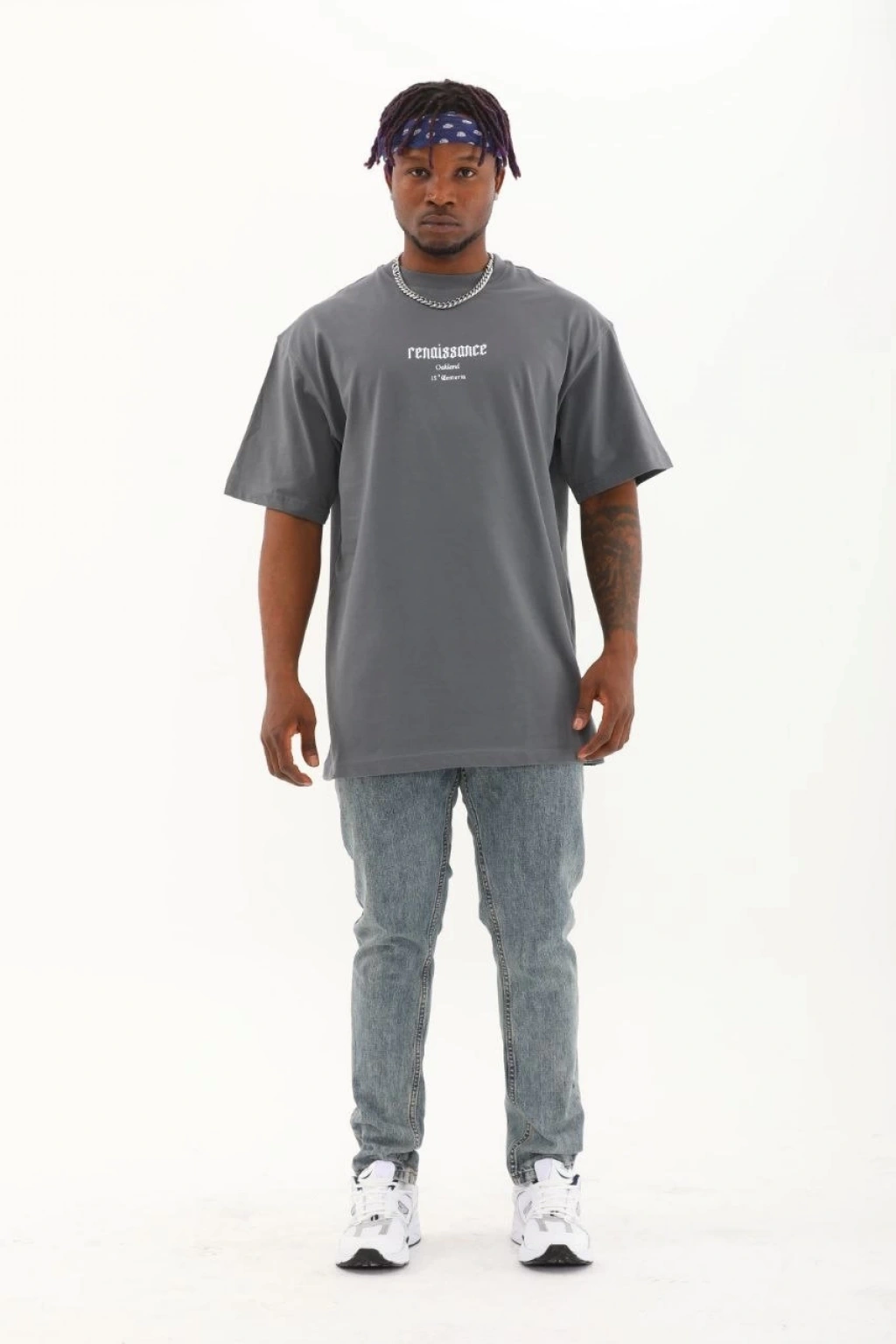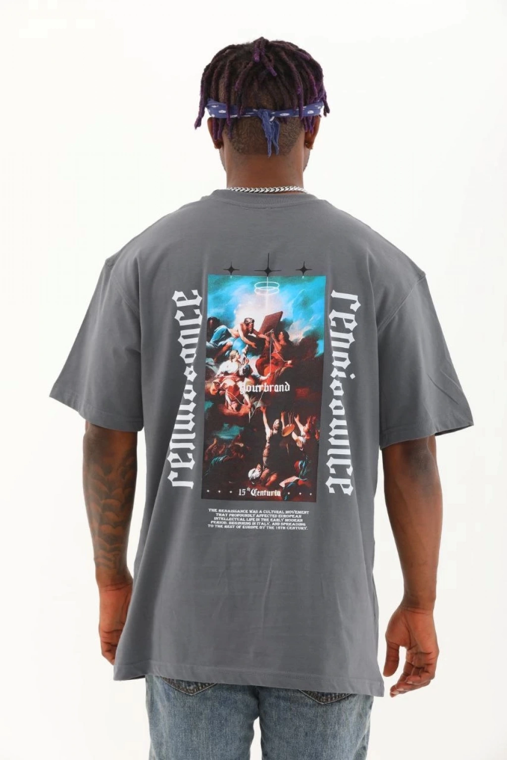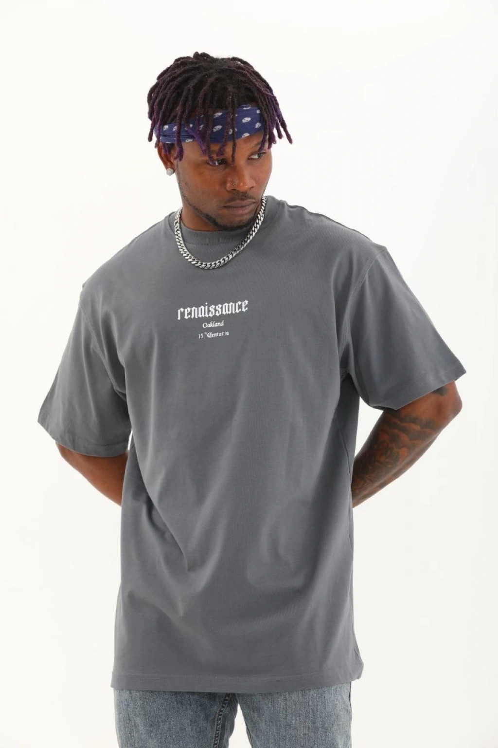 Unisex Oversize Baskılı Bisiklet Yaka T-Shirt - Füme