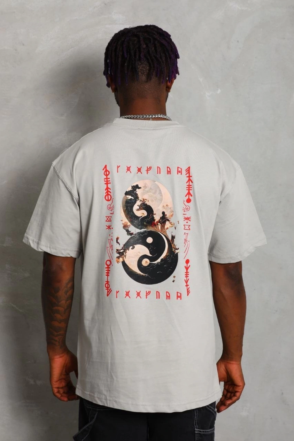 Unisex Oversize Baskılı Bisiklet Yaka T-shirt - Gri