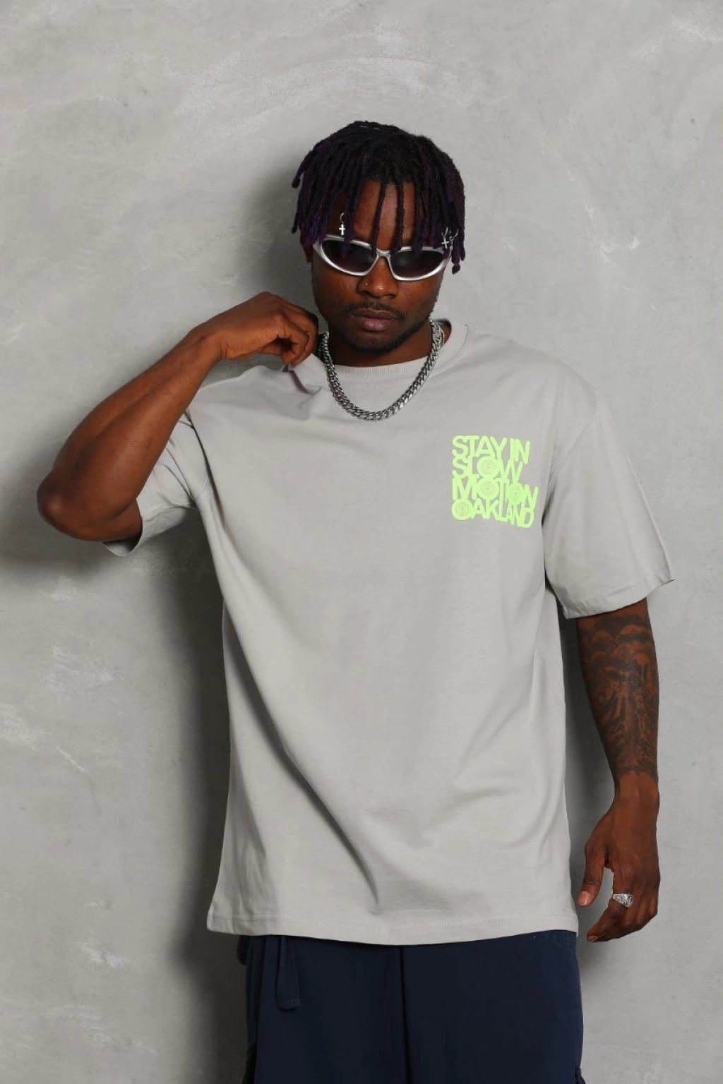 Unisex Oversize Baskılı Bisiklet Yaka T-Shirt - Gri