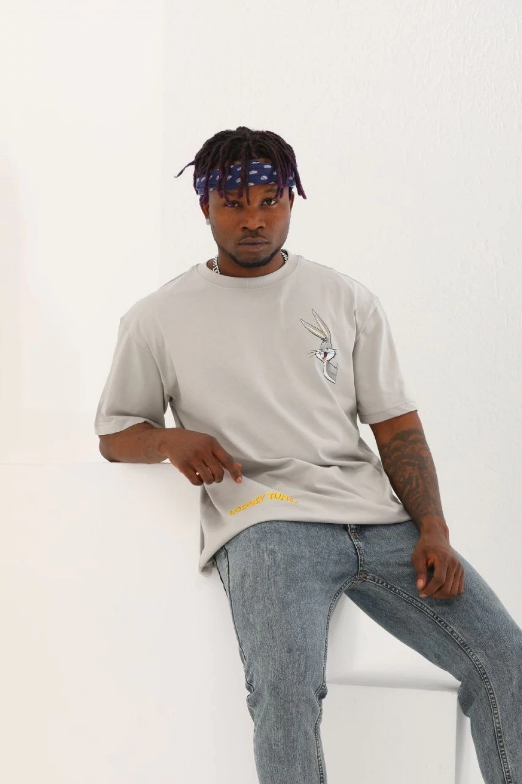 Unisex Oversize Baskılı Bisiklet Yaka T-shirt - Gri