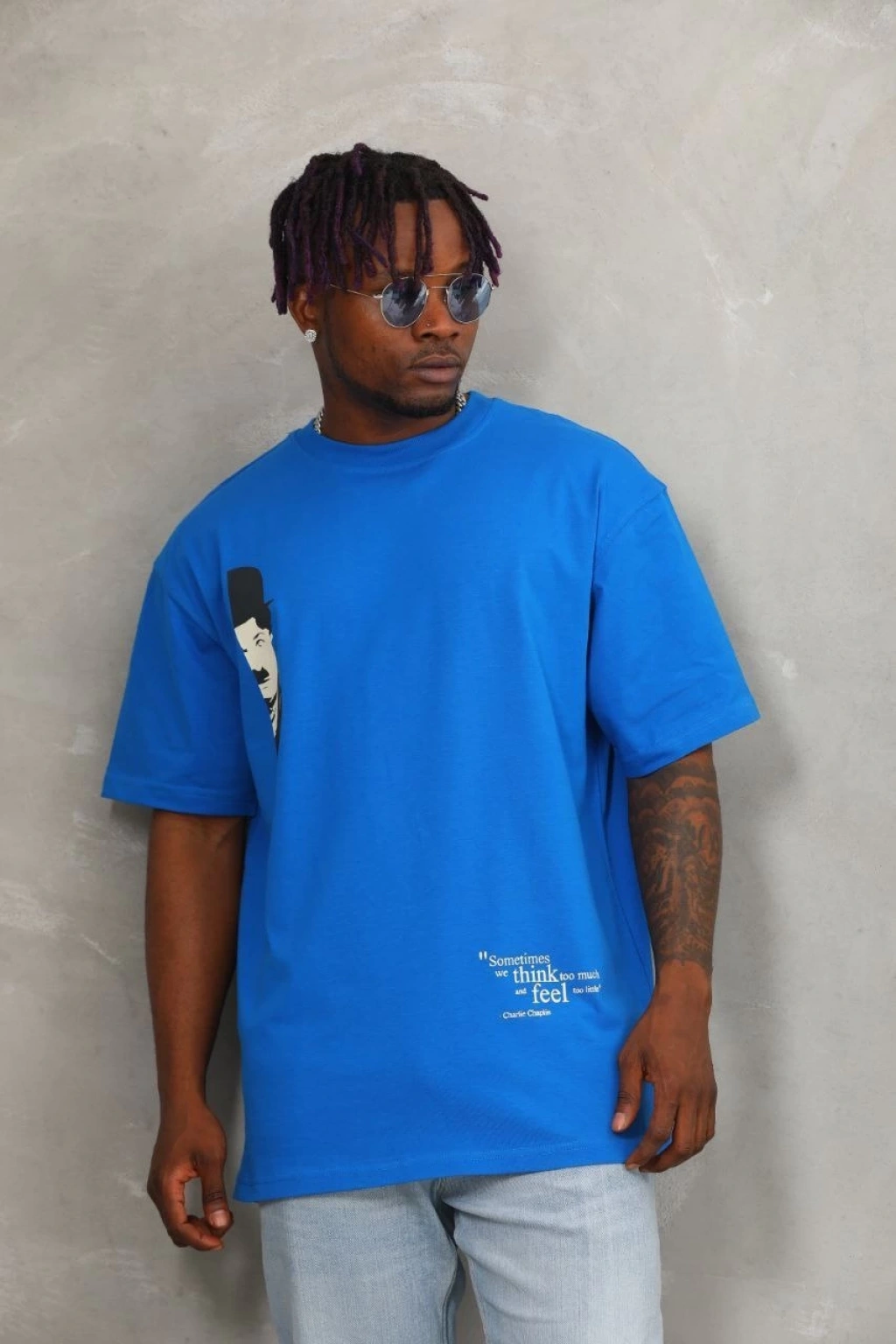 Unisex Oversize Baskılı Bisiklet Yaka T-Shirt - Mavi