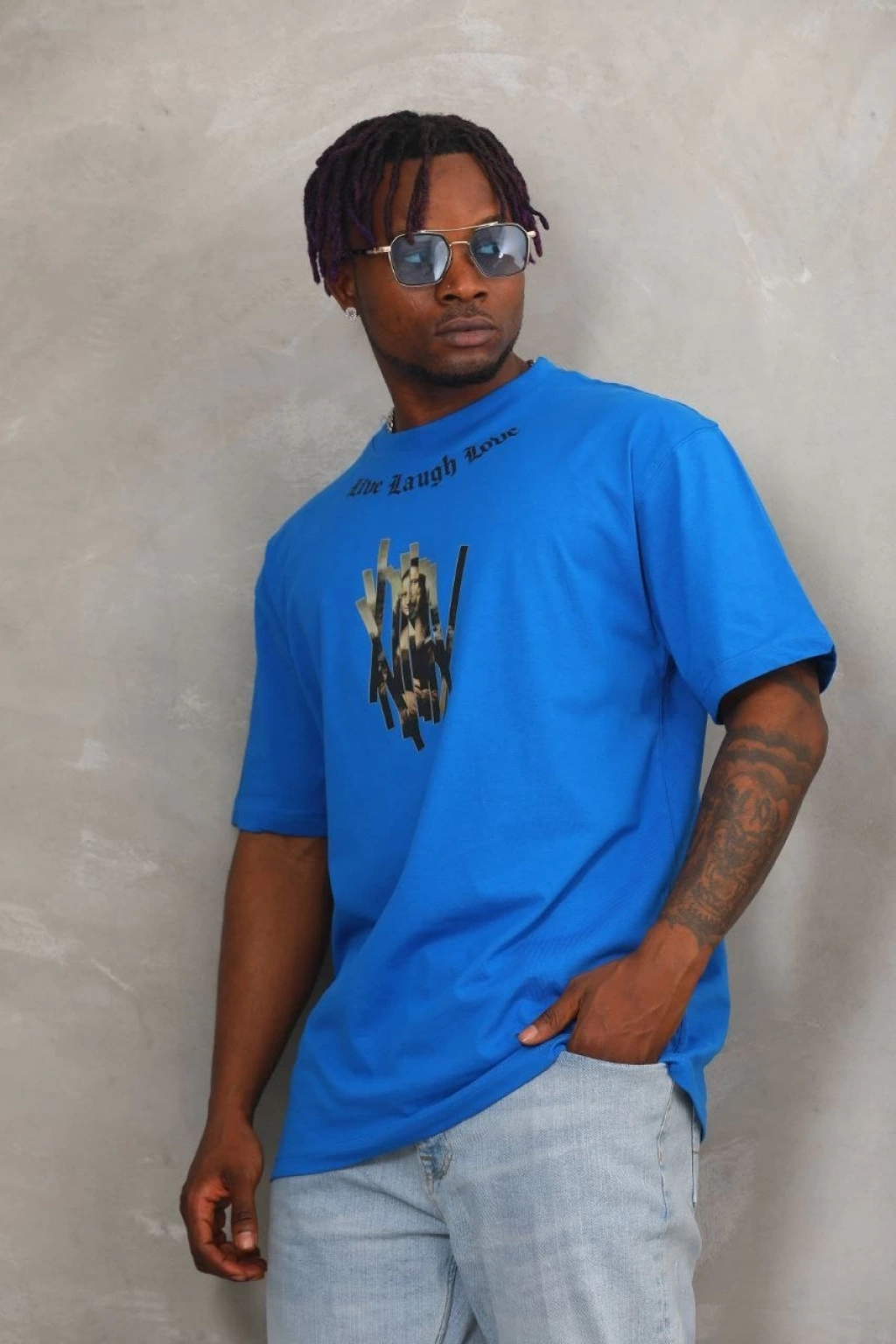 Unisex Oversize Baskılı Bisiklet Yaka T-shirt - Mavi