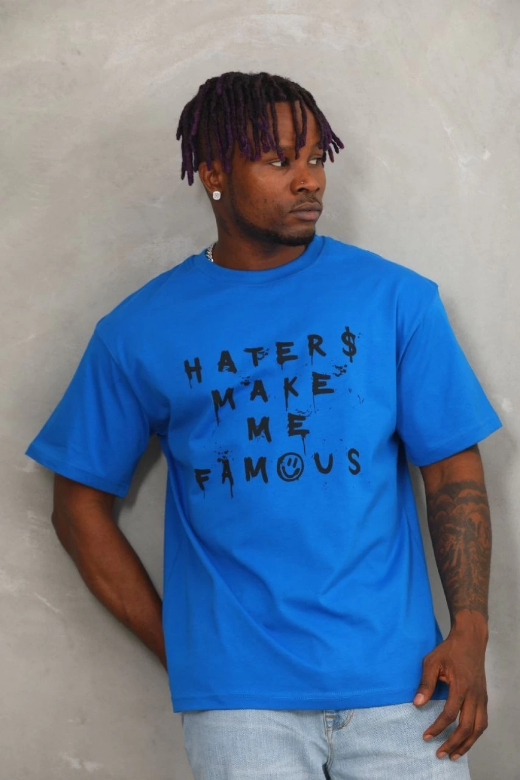 Unisex Oversize Baskılı Bisiklet Yaka T-Shirt - Mavi