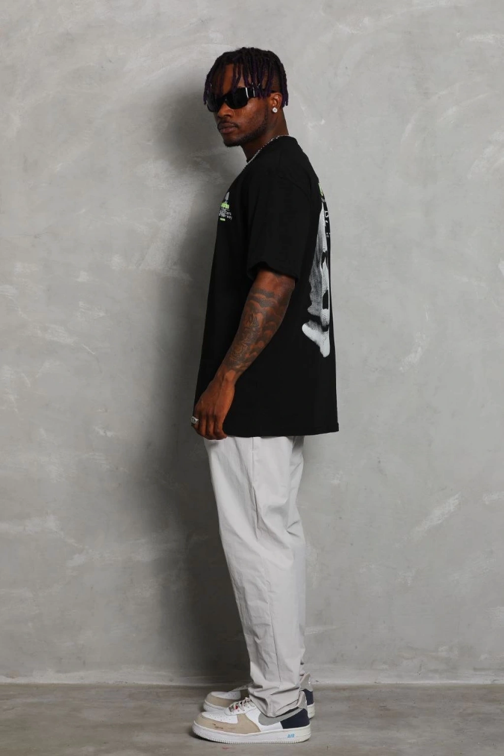 Benzersiz Sırt Baskılı Erkek Sokak Stili Bol Tişört - Nefes Alabilir Polyester, Makinede Yıkanabilir - Siyah