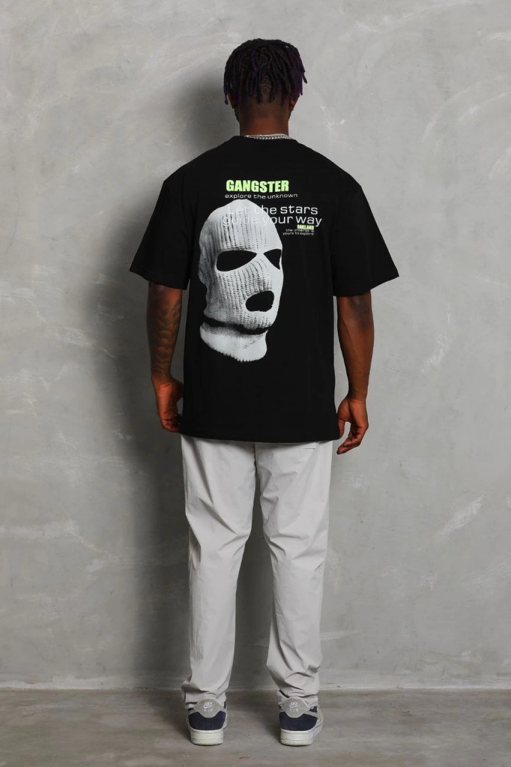 Unisex Oversize Baskılı Bisiklet Yaka T-Shirt - Siyah