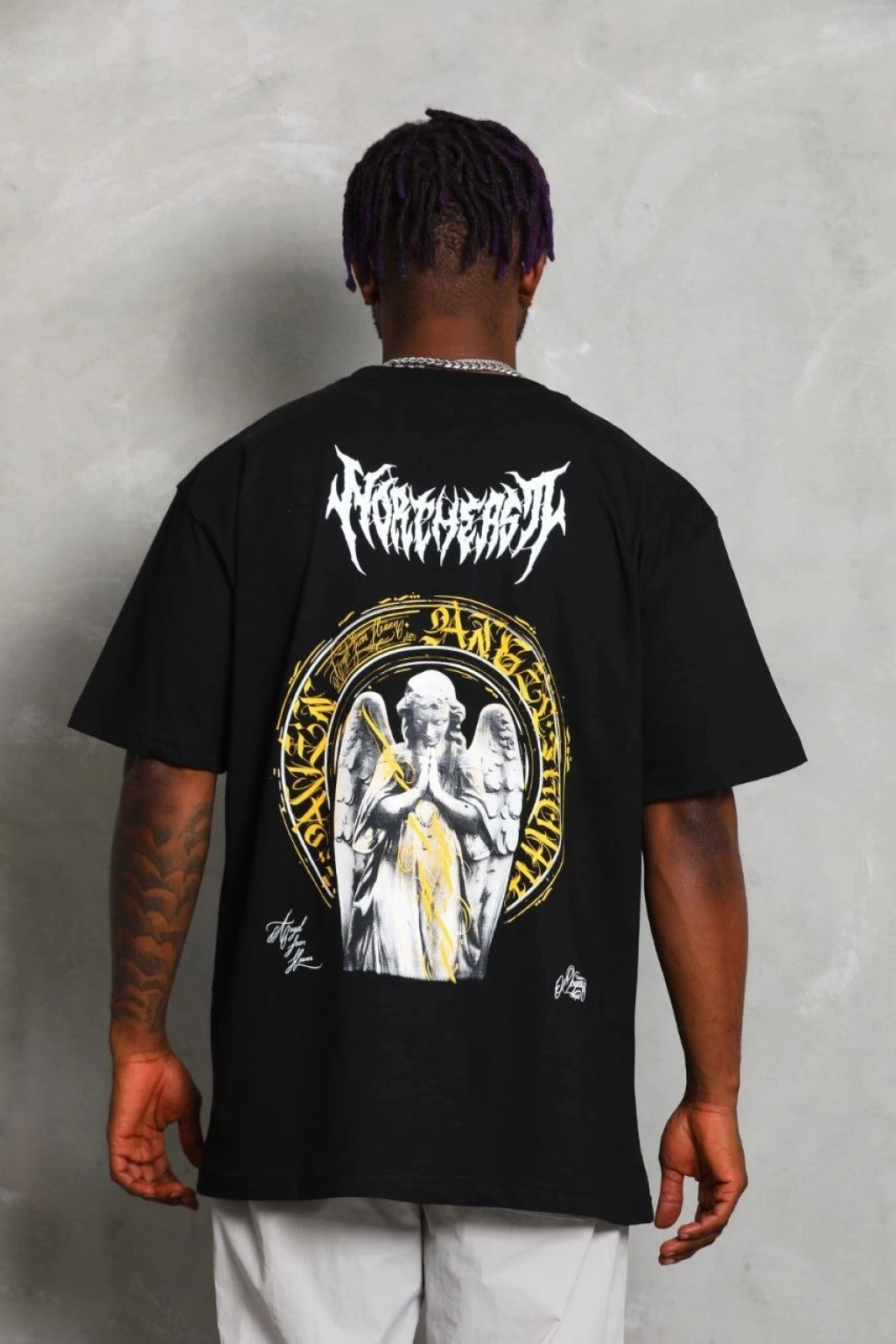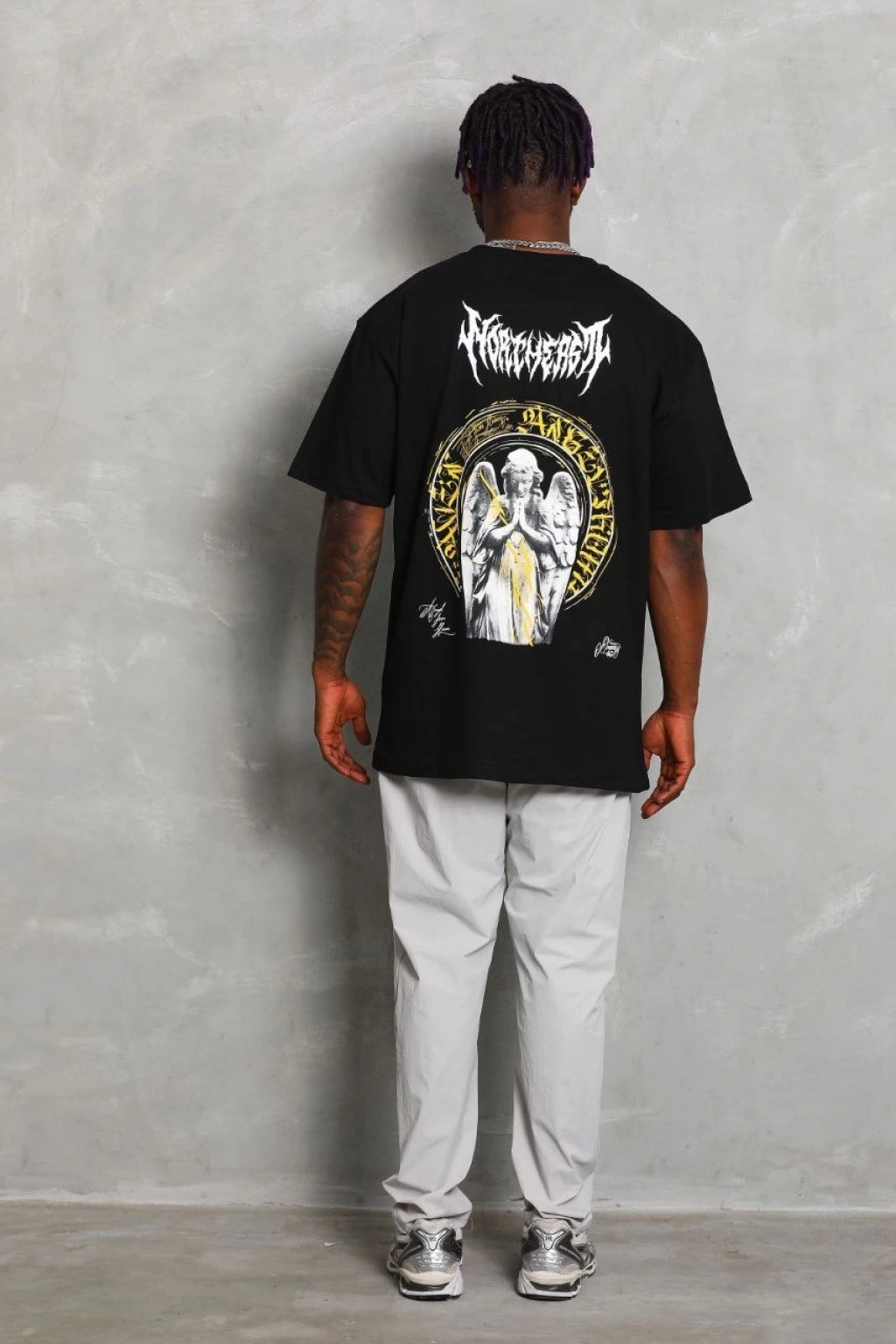 Unisex Oversize Baskılı Bisiklet Yaka T-Shirt - Siyah
