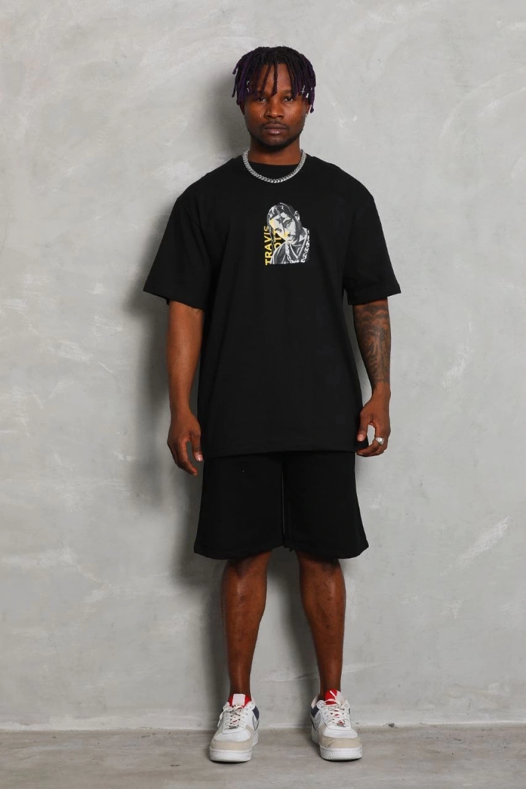 Unisex Oversize Baskılı Bisiklet Yaka T-Shirt - Siyah