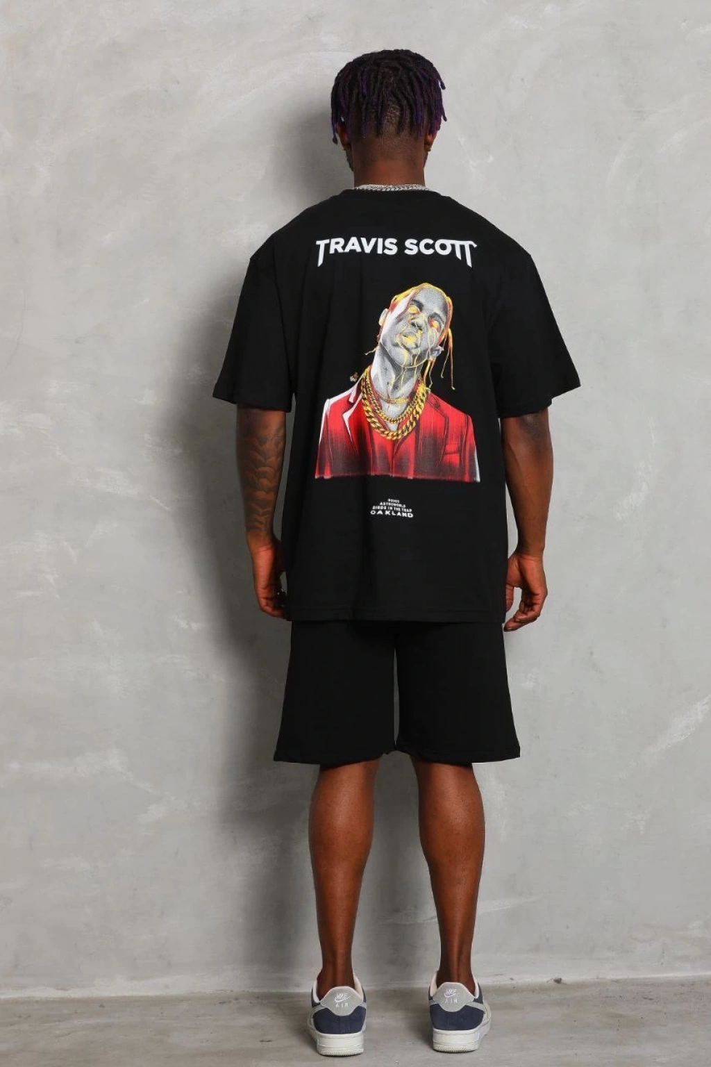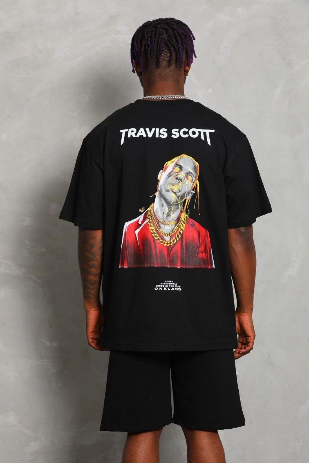 Benzersiz Sırt Baskılı Erkek Sokak Stili Bol Tişört - Nefes Alabilir Polyester, Makinede Yıkanabilir - Siyah