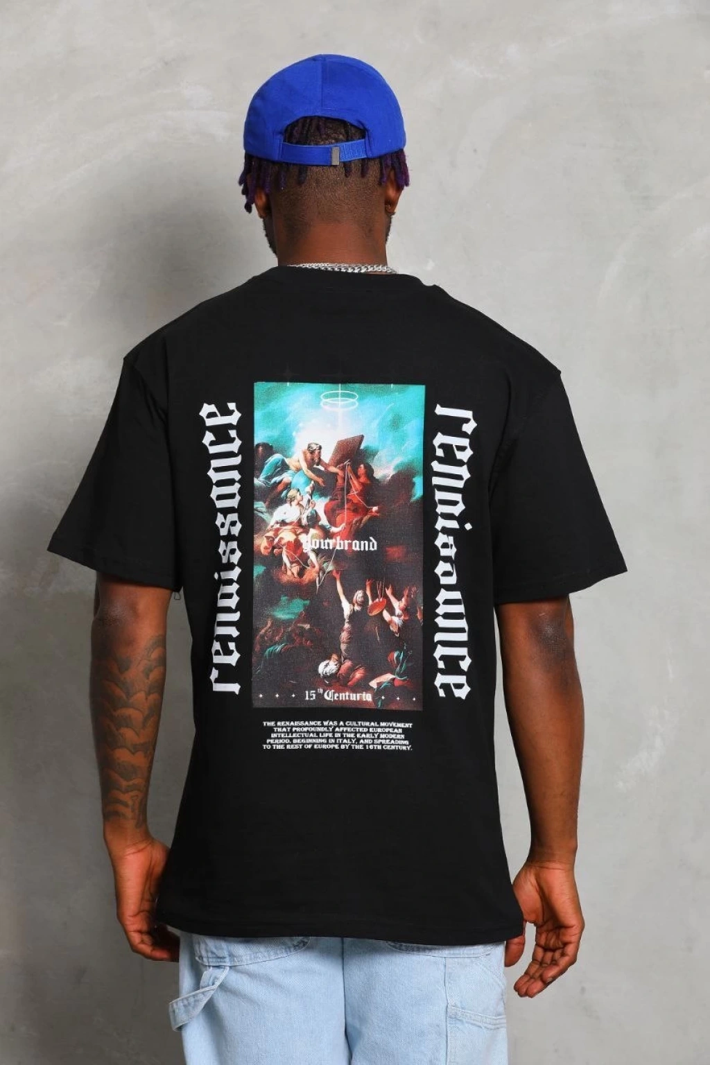 Unisex Oversize Baskılı Bisiklet Yaka T-Shirt - Siyah