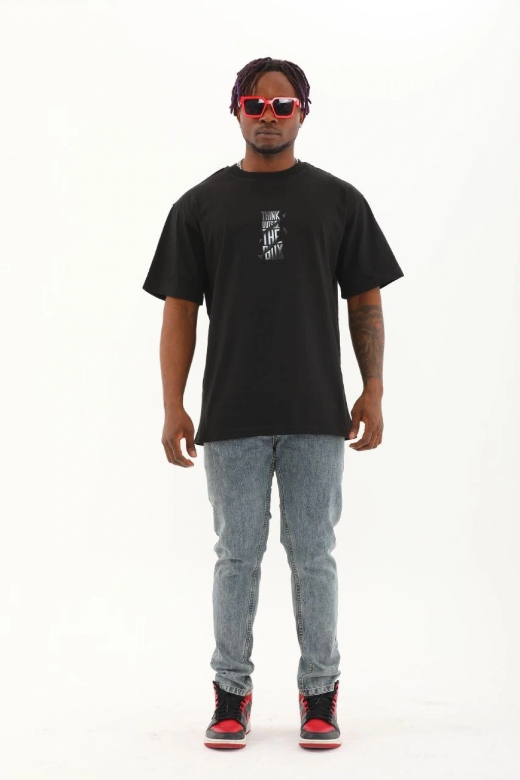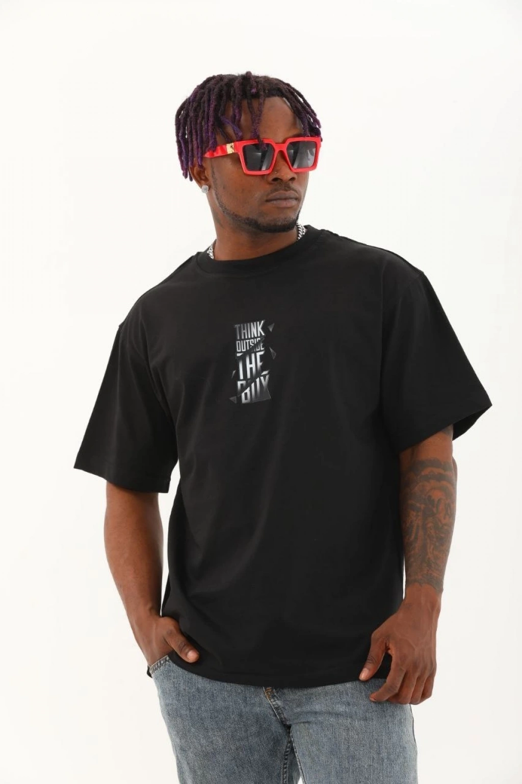 Unisex Oversize Baskılı Bisiklet Yaka T-shirt - Siyah