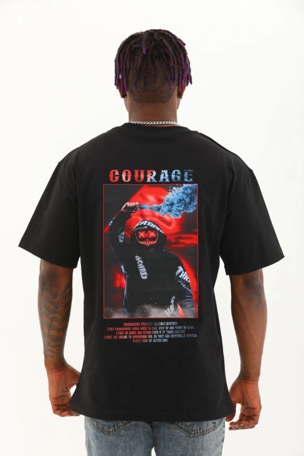 Erkek OversizeGrafik Tişört "CAMPBRASTCOOPERATION" Kalın Yazı Bisiklet Yaka, Kısa Kol, Kalın Mor ve Siyah Desenli Yazlık Sokak Kıyafeti - Siyah
