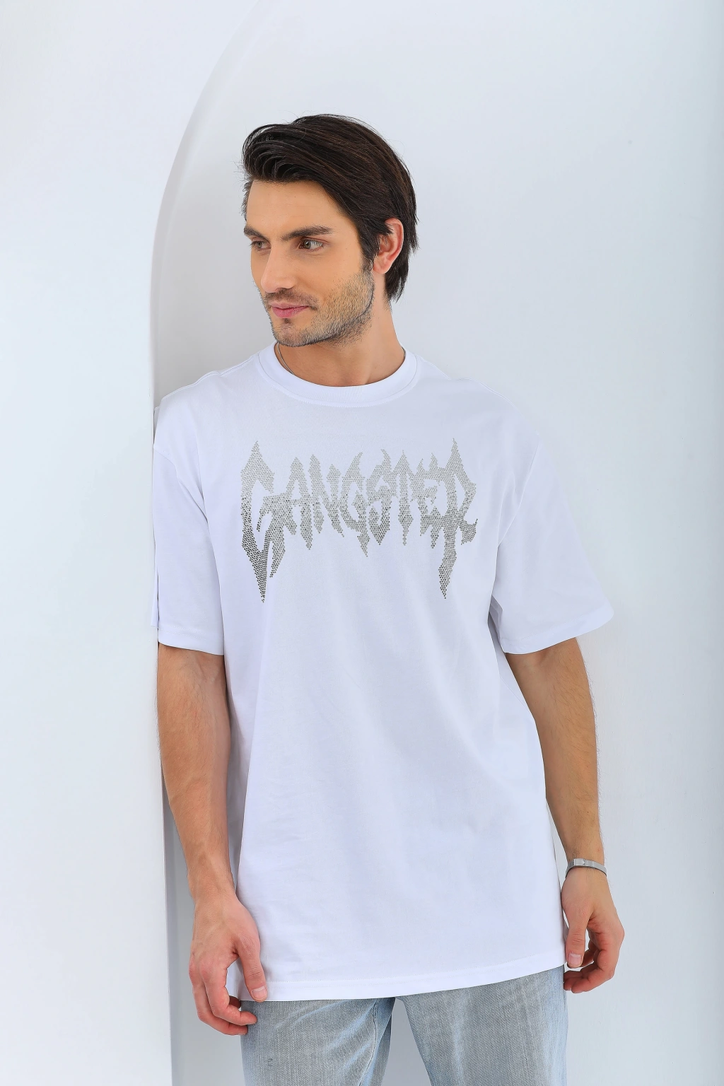 Unisex Oversize Taşlı Bisiklet Yaka T-Shirt - Beyaz
