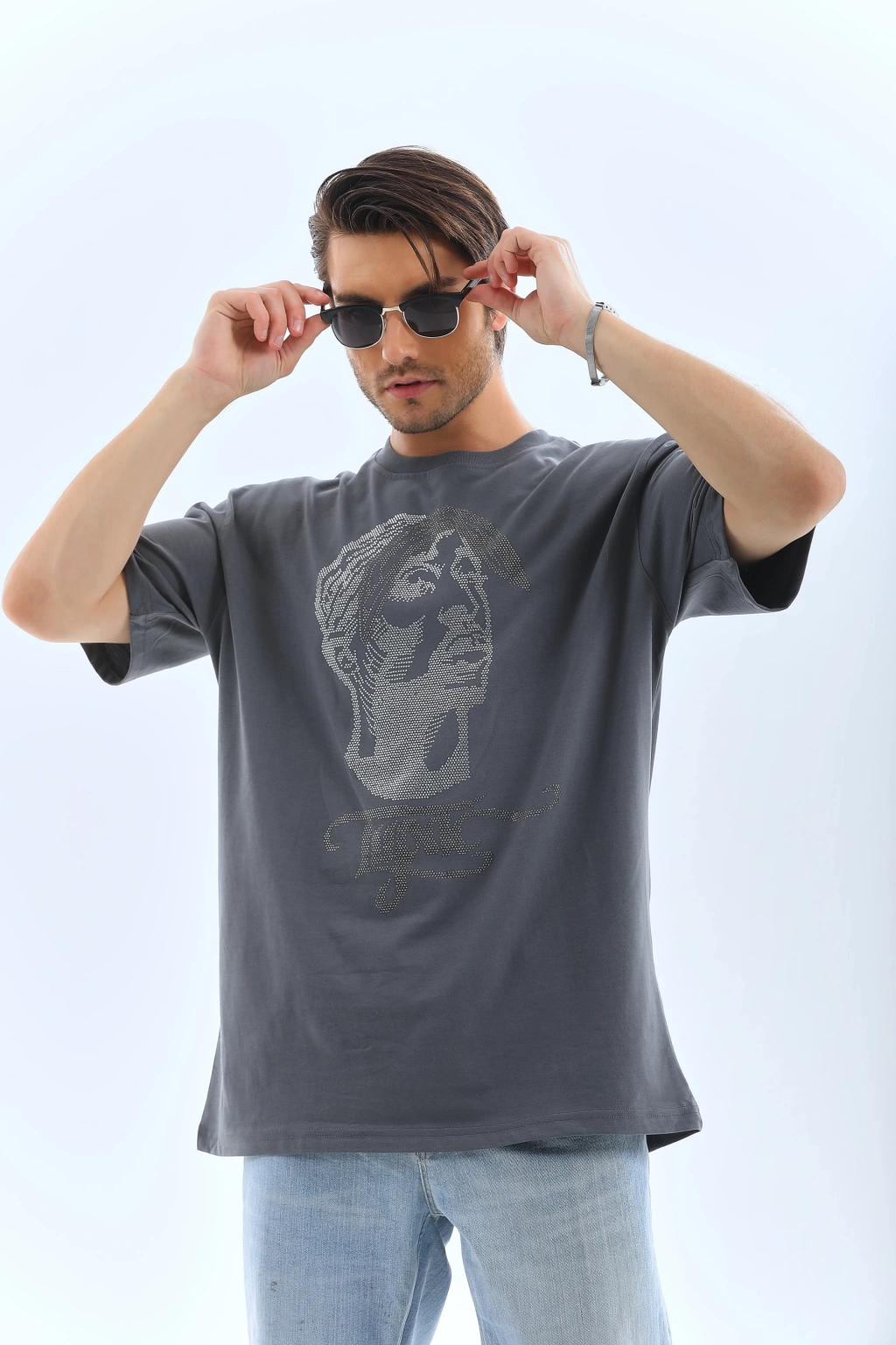 Unisex Oversize Taşlı Bisiklet Yaka T-Shirt - Füme
