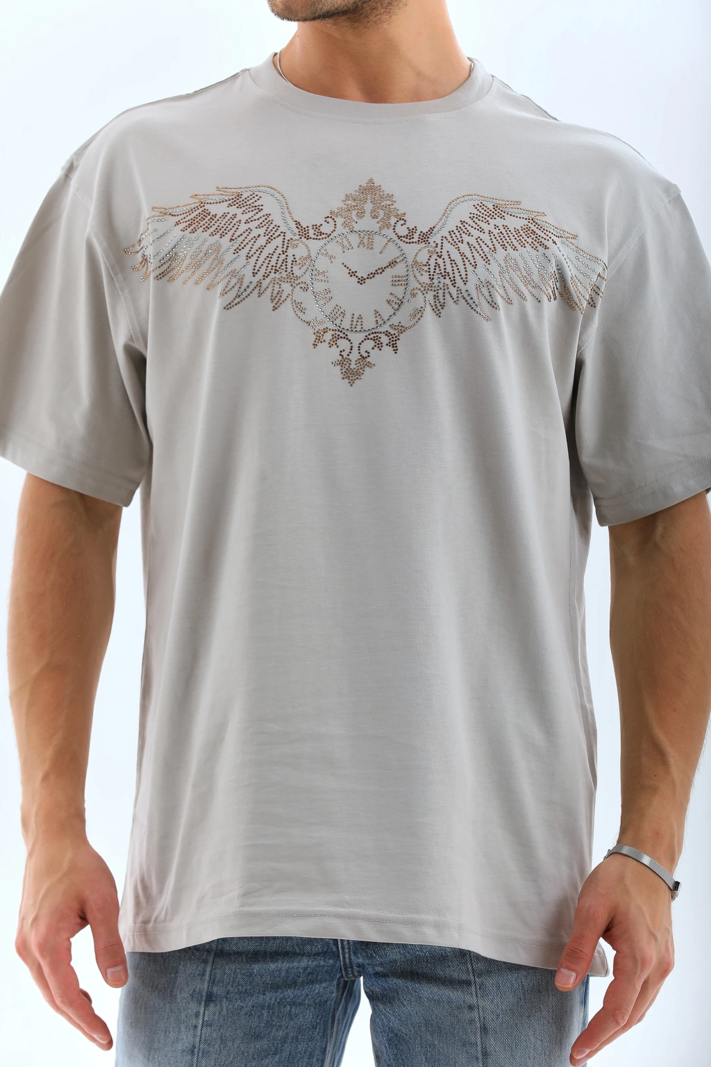 Unisex Oversize Taşlı Bisiklet Yaka T-Shirt - Gri
