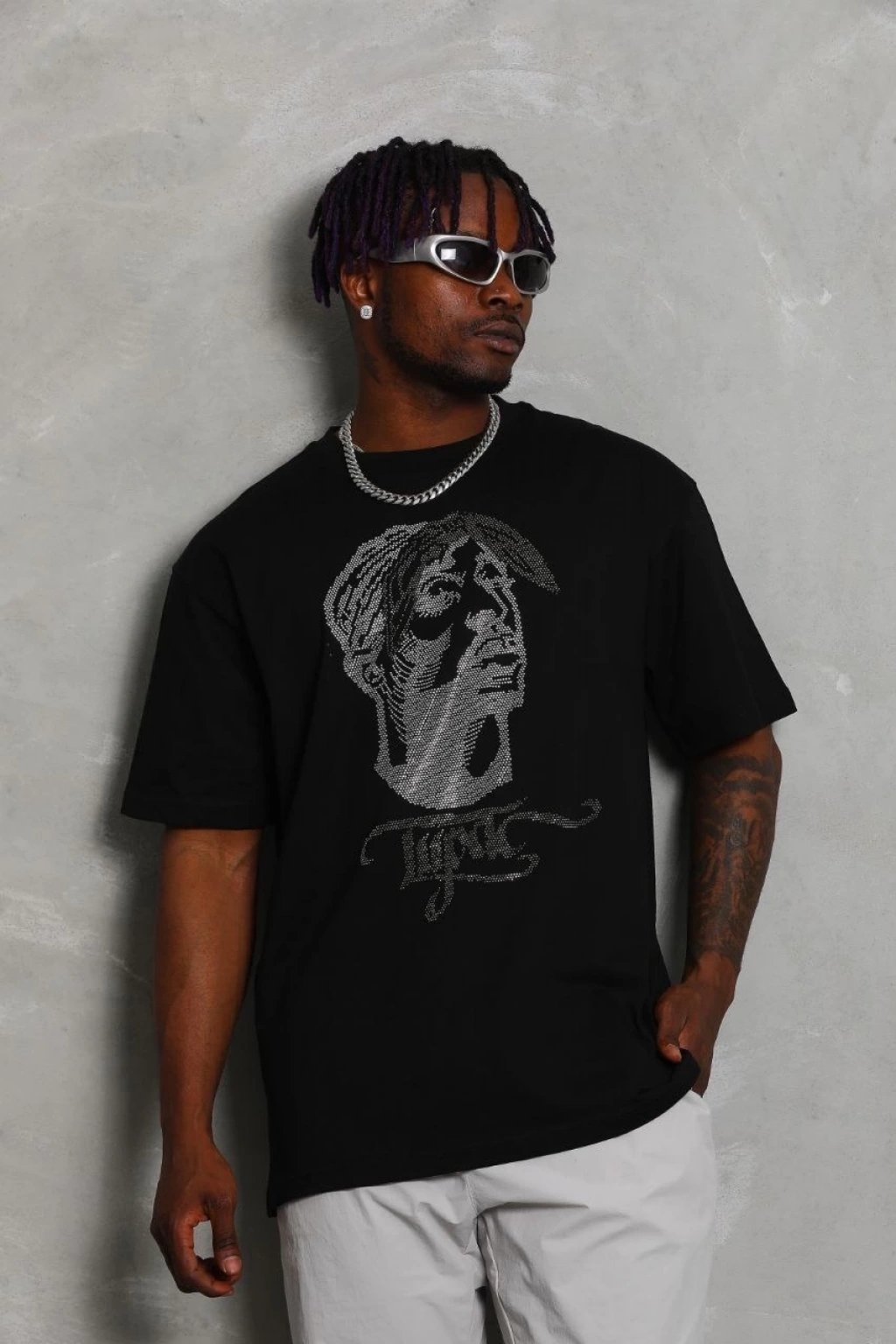 Unisex Oversize Taşlı Bisiklet Yaka T-Shirt - Siyah