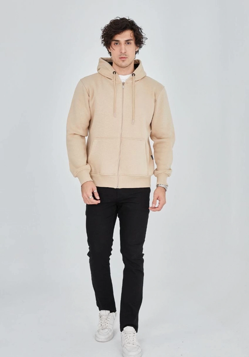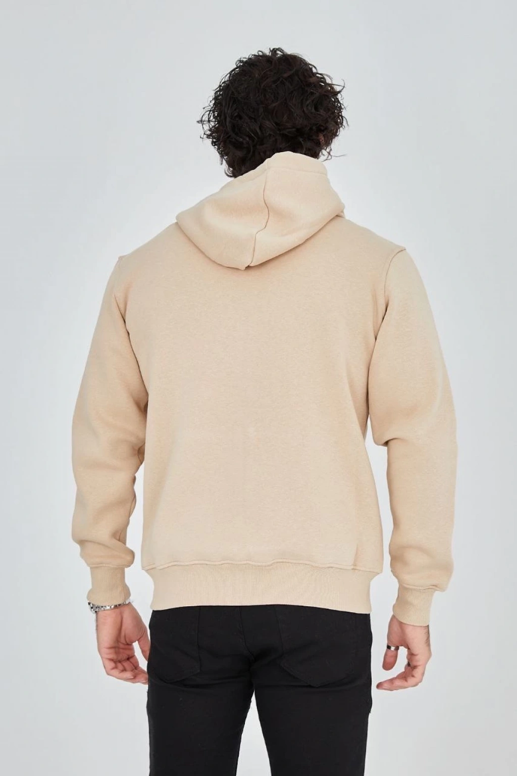 Erkek Patlı Yaka Üç İplik Pamuklu Sweatshirt Double Oversize Rahat Kalıp Günlük Kullanım – Bej