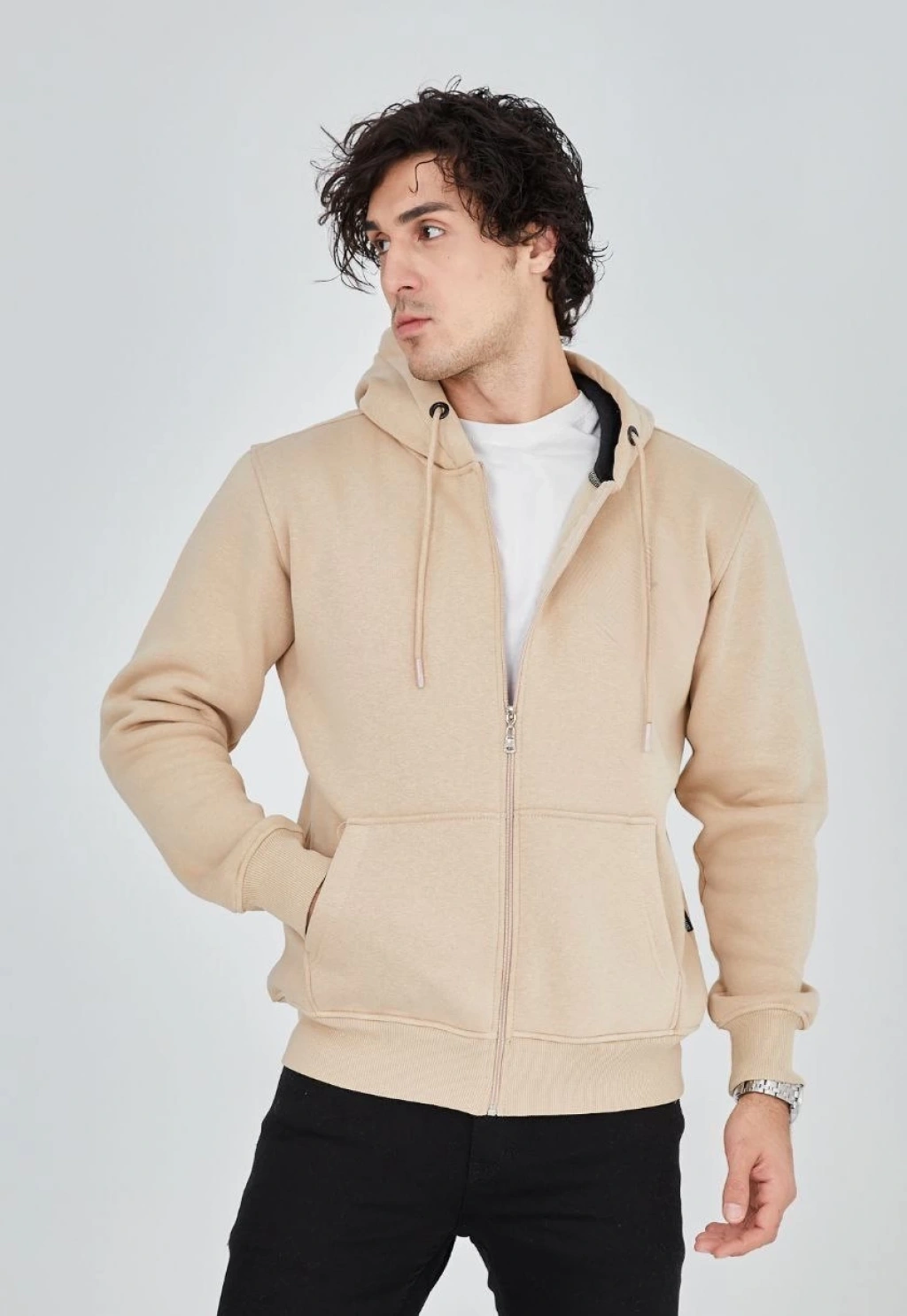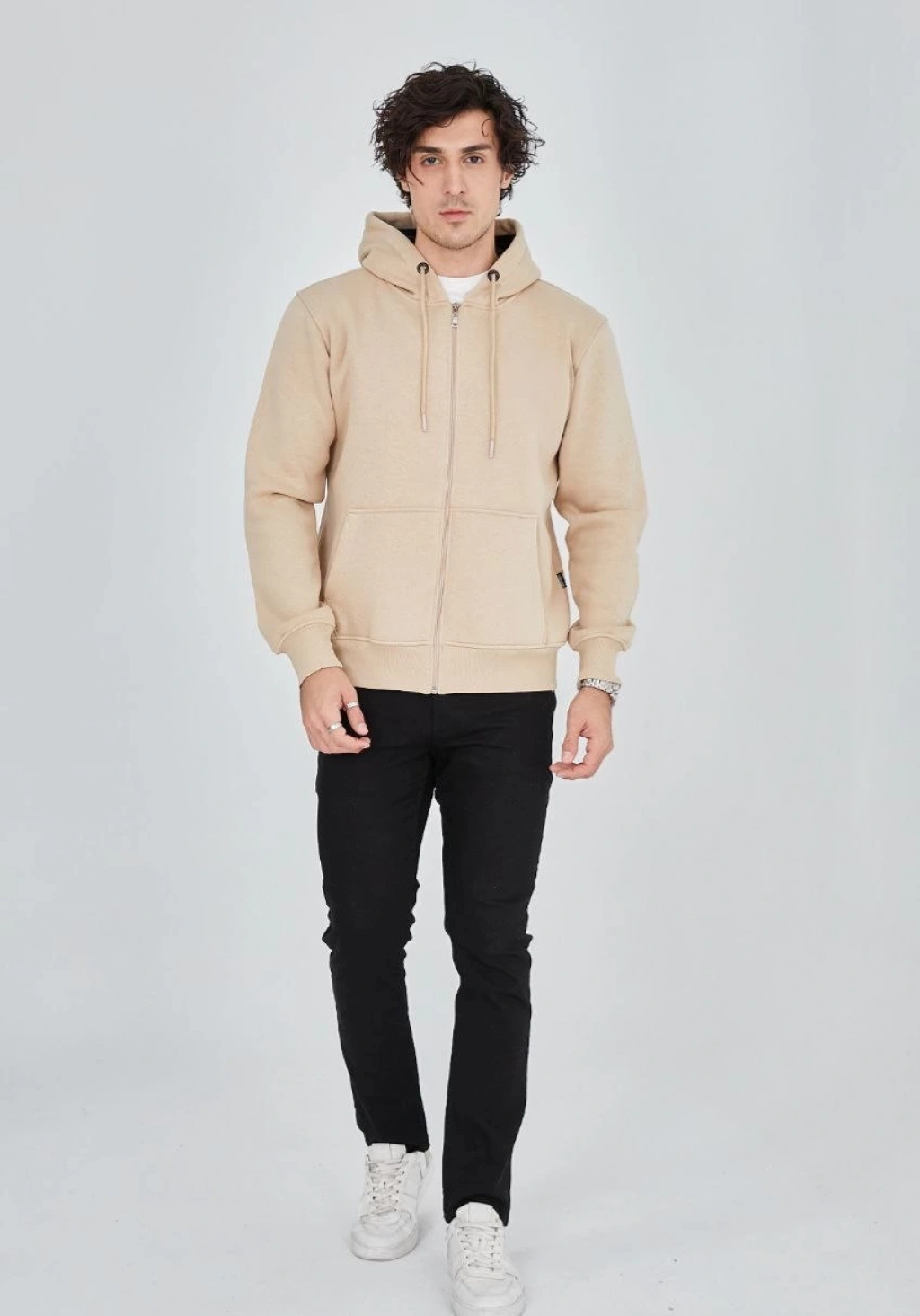Erkek Oversize Üç İplik Kapüşonlu Sweatshirt – Beyaz Ön Baskılı, Kanguru Cepli, Rahat Kalıp, İçi Pamuklu Model