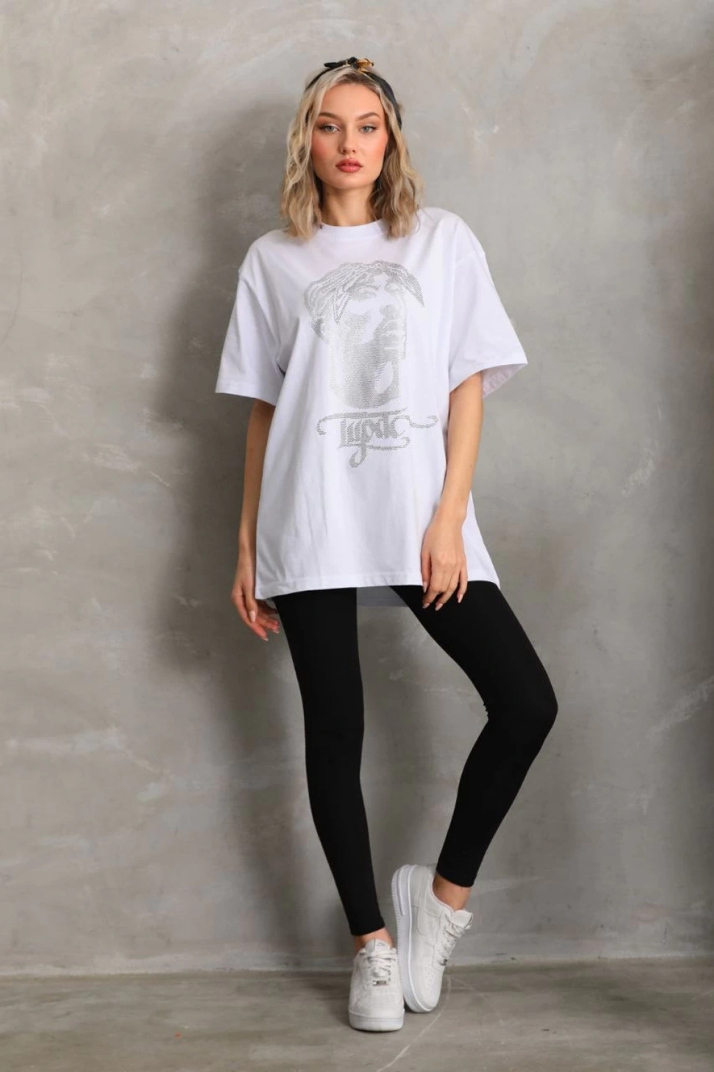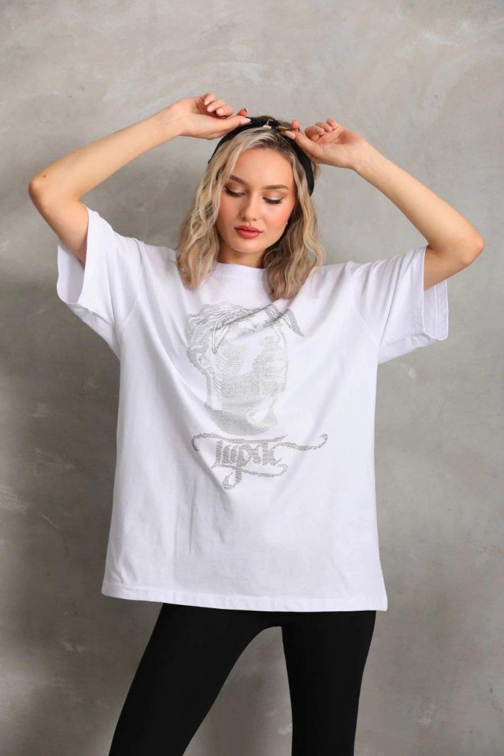 ÖRDEK BASKILI VE YUVARLAK YAKALI KADIN GÜNLÜK BÜYÜK BOY SİYAH TİŞÖRT. - BEYAZ