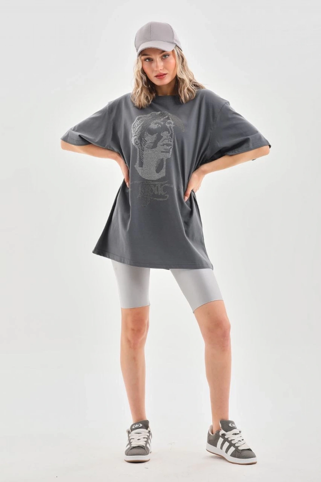 AICG ÖN ARKA BASKILI BİSİKLET YAKA KADIN OVERSİZE BİSİKLET YAKA T-SHİRT - SİYAH
