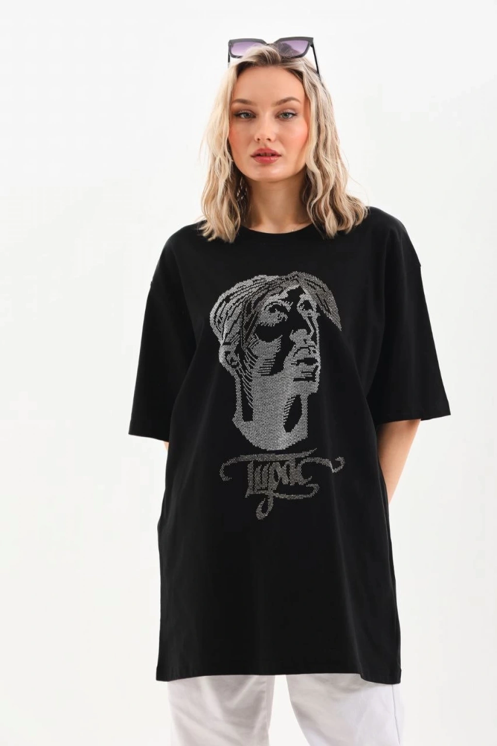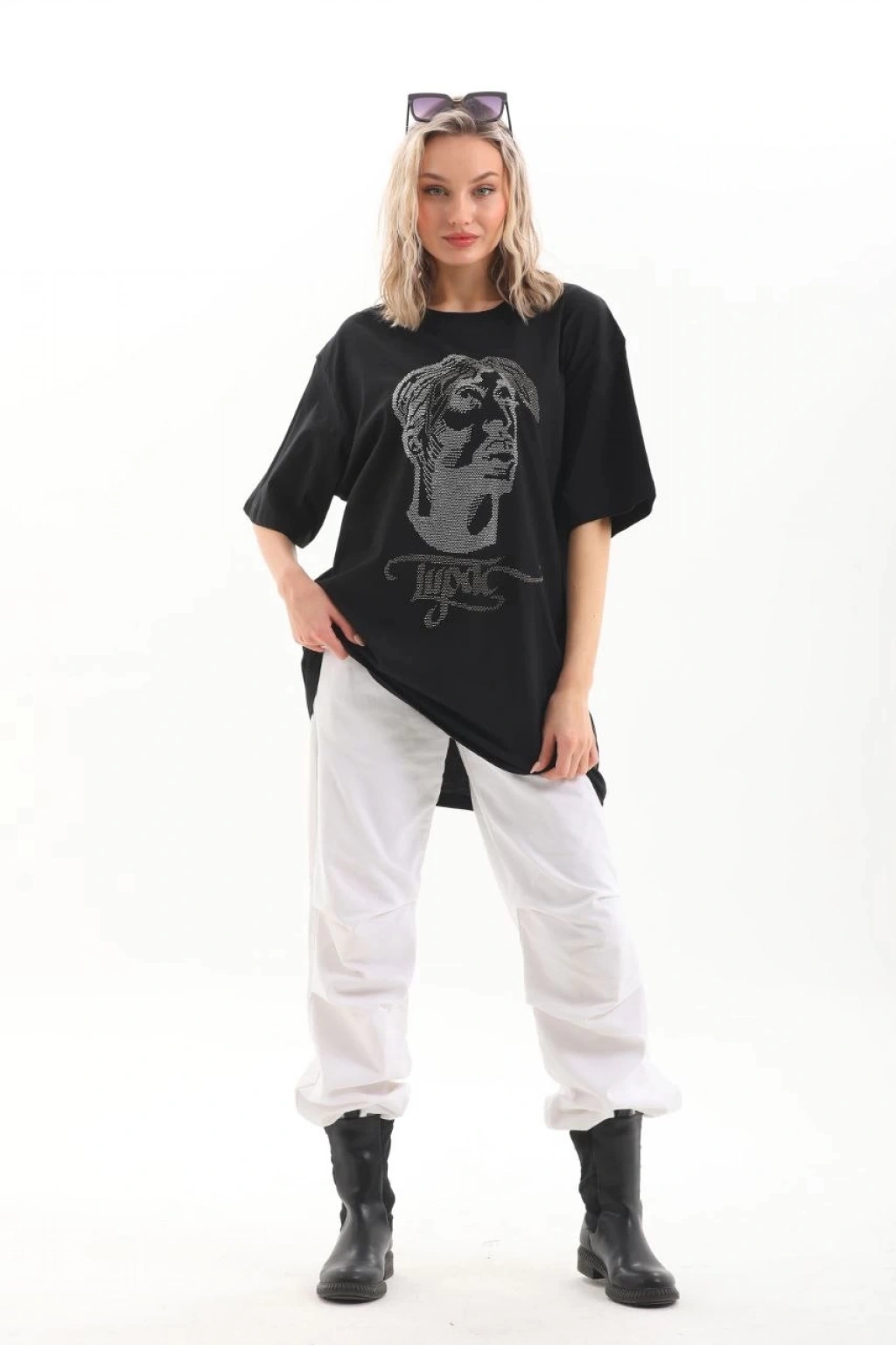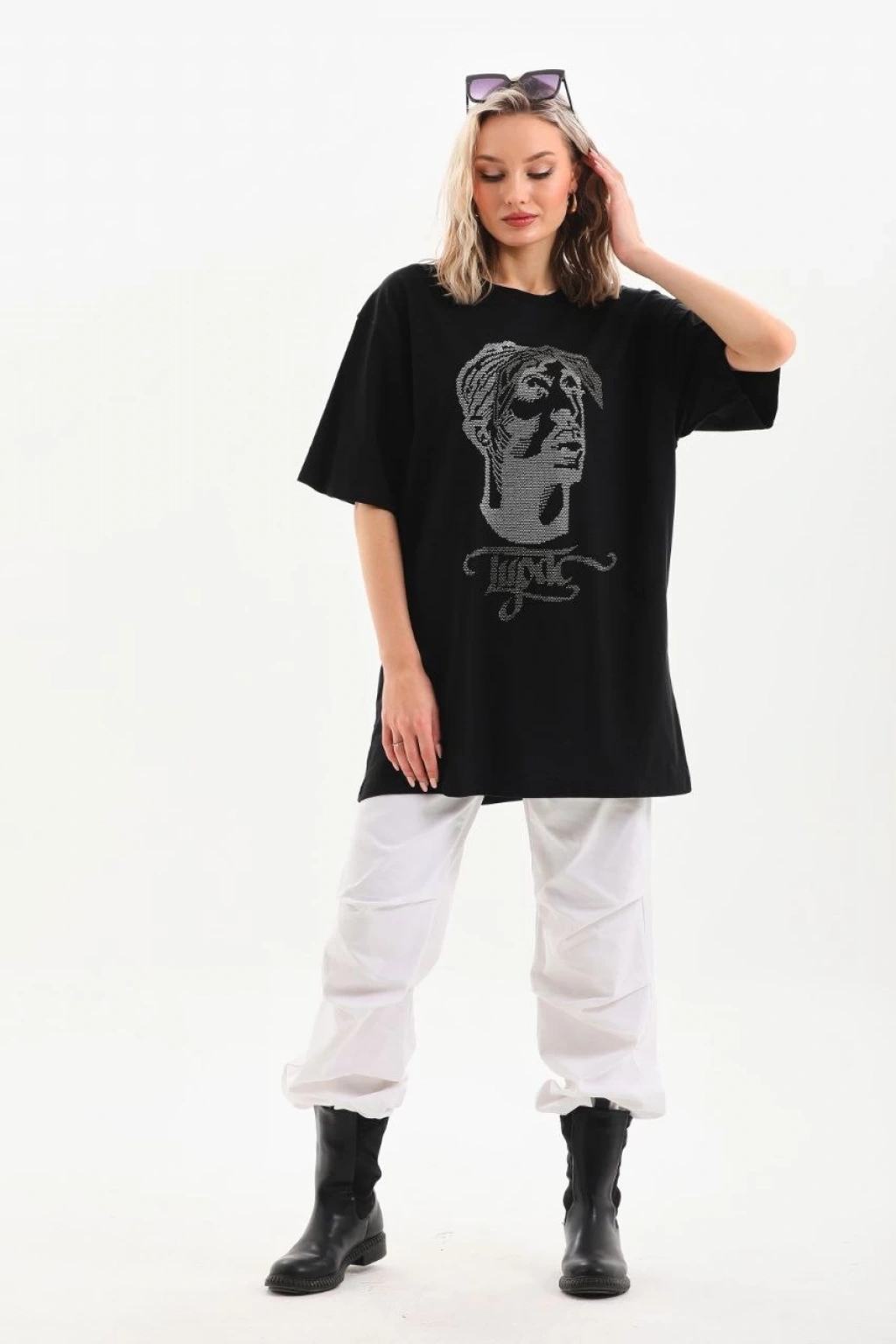 Unisex Taş Desenli Oversize T-Shirt - Siyah