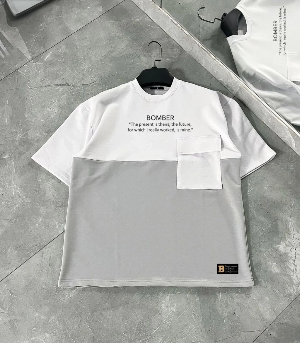 Unisex Torba Cep Detaylı Parçalı T-Shirt - Gri