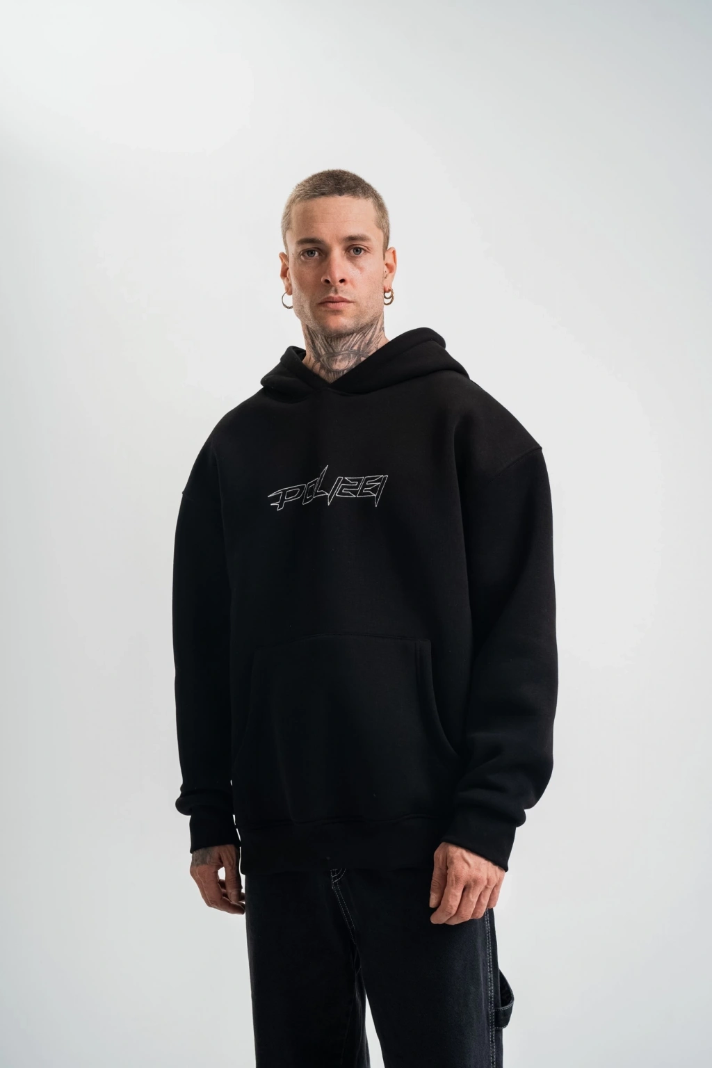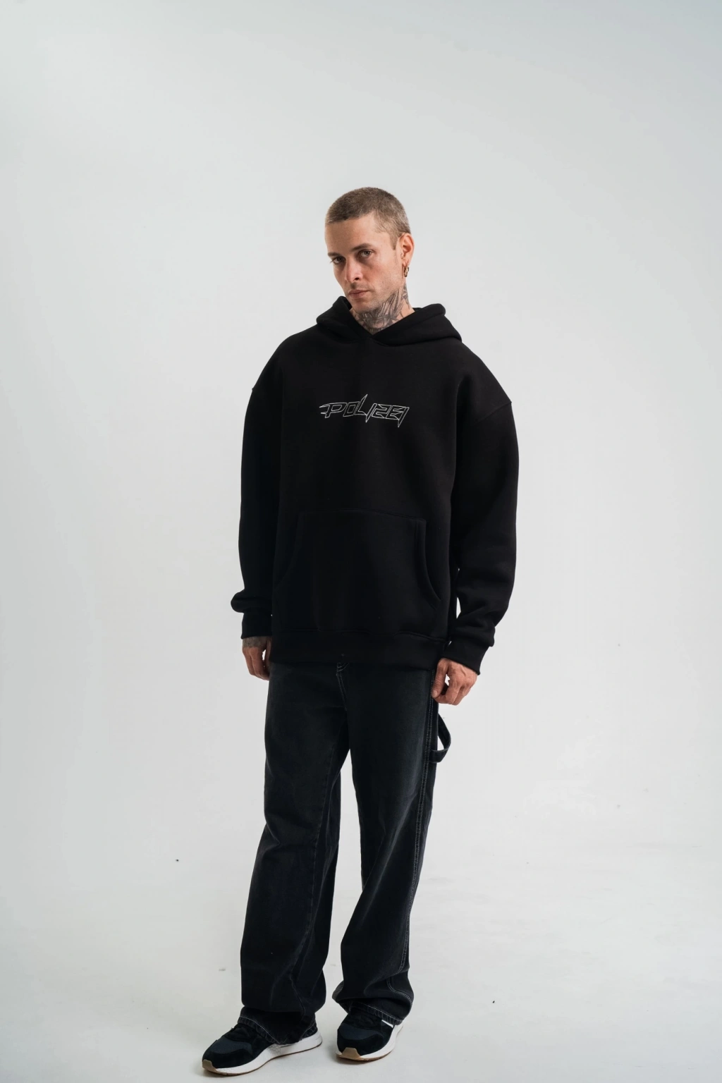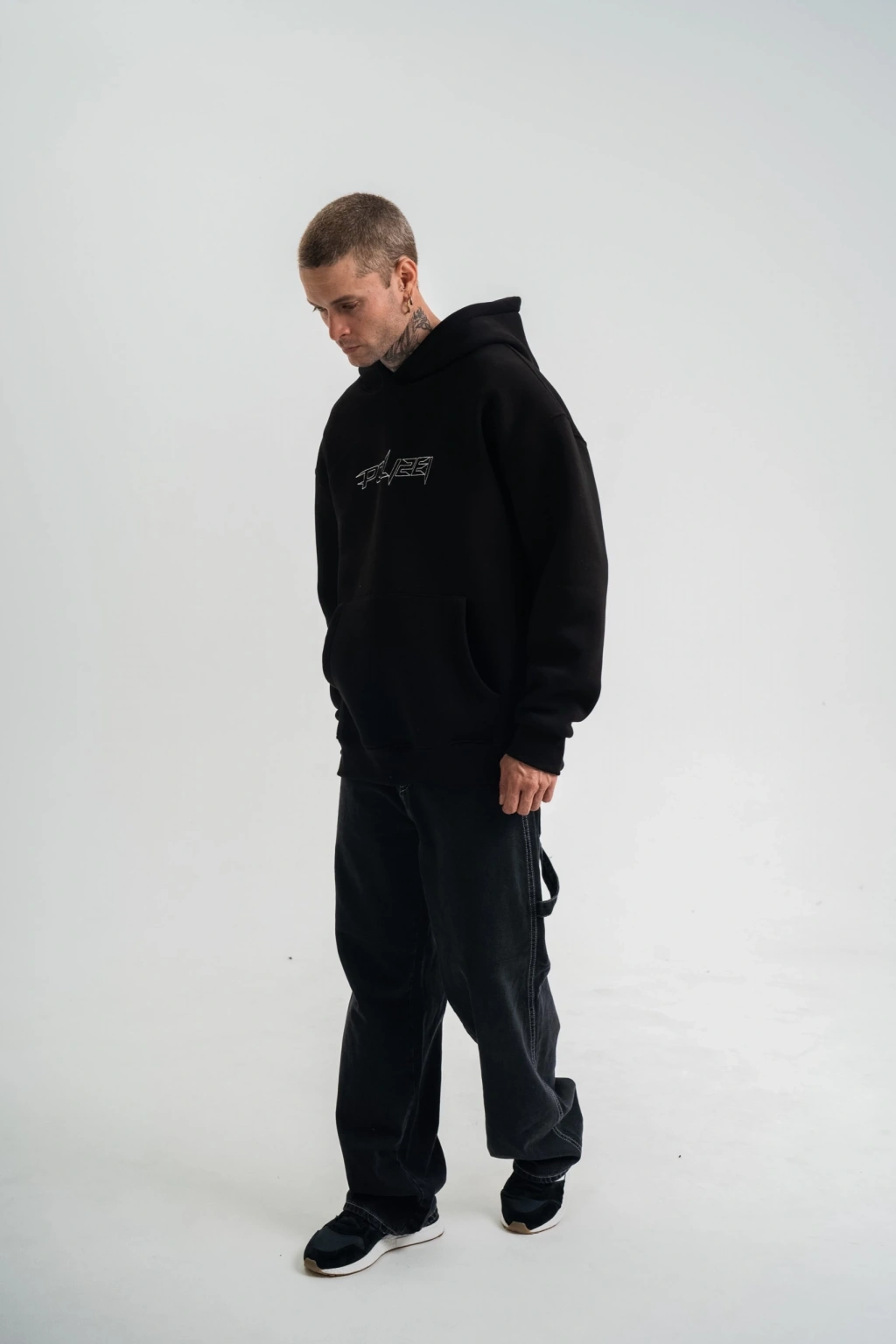 Erkek Oversize Üç İplik Kapüşonlu Sweatshirt – Siyah Sırt ve Ön Baskılı, Kanguru Cepli, Rahat Kalıp, İçi Pamuklu ModeL-Siyah