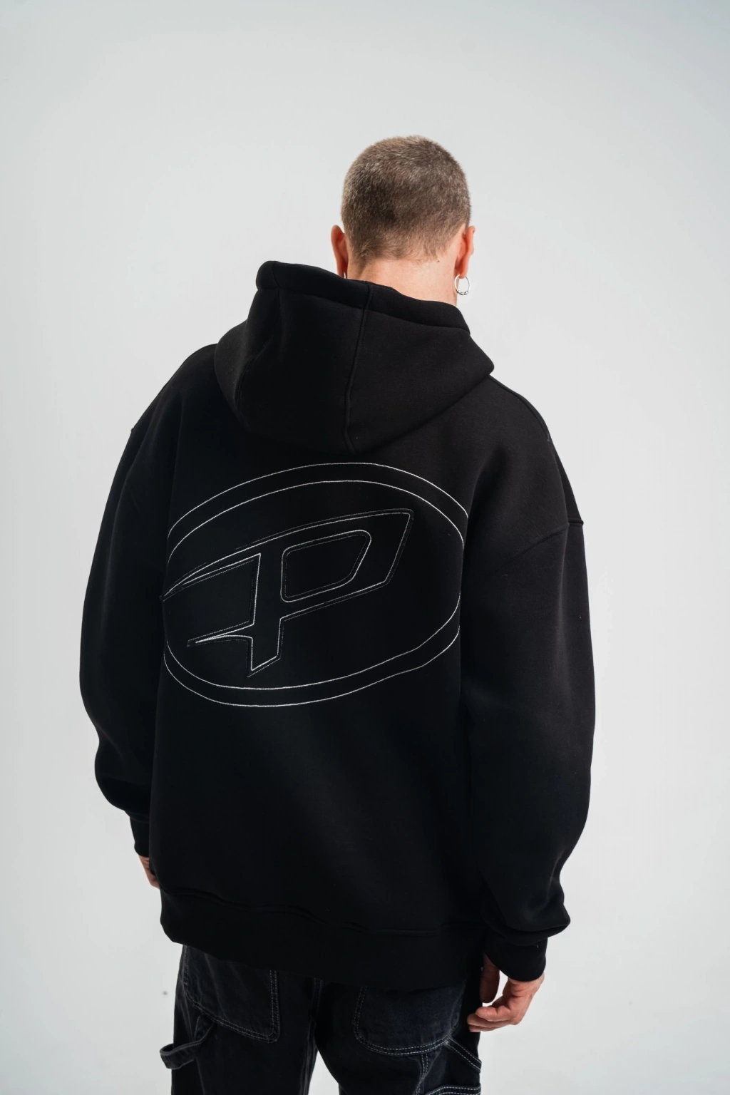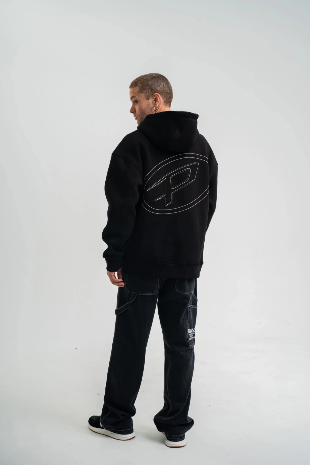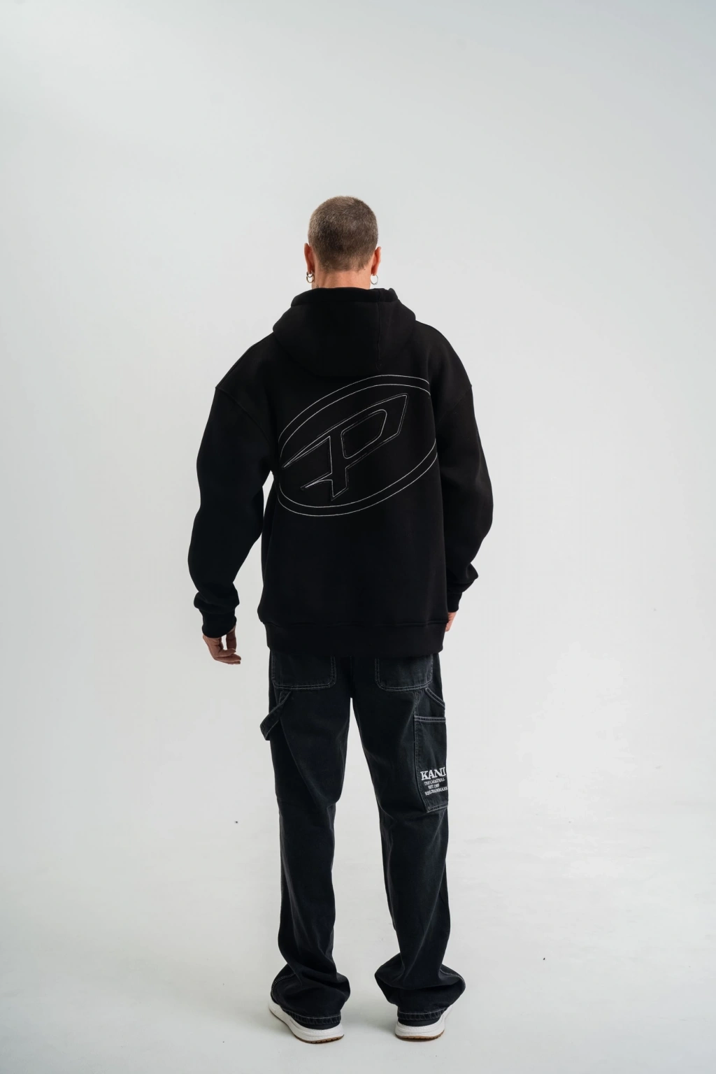 Erkek Oversize Üç İplik Kapüşonlu Sweatshirt – Siyah Sırt ve Ön Baskılı, Kanguru Cepli, Rahat Kalıp, İçi Pamuklu ModeL-Siyah