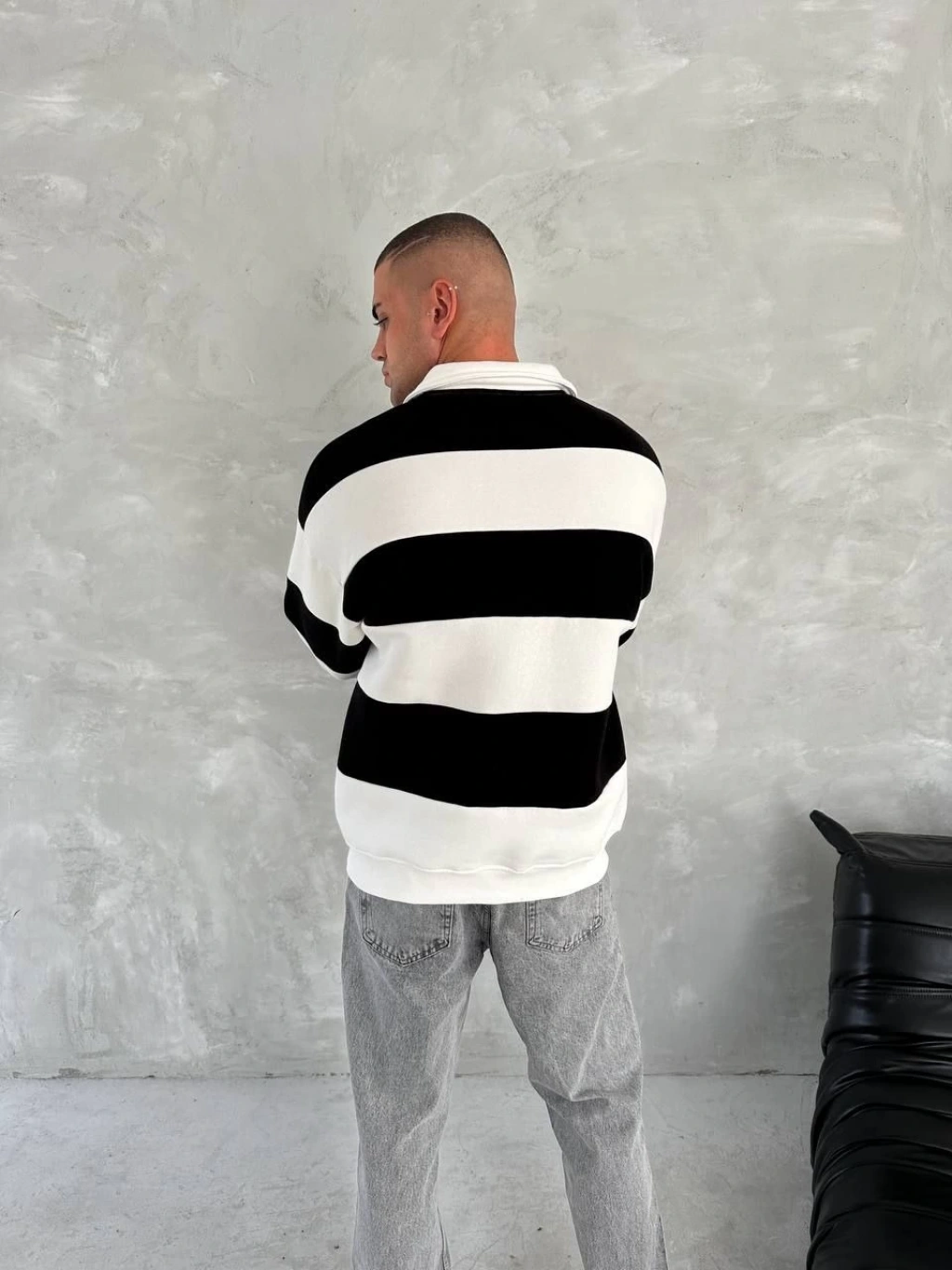 Erkek Oversize Üç İplik Kapüşonlu Sweat – Siyah Kol ve Etek Ribana Detaylı, Ön ve Sırt Baskılı, Kanguru Cepli Rahat Kalıp Model
