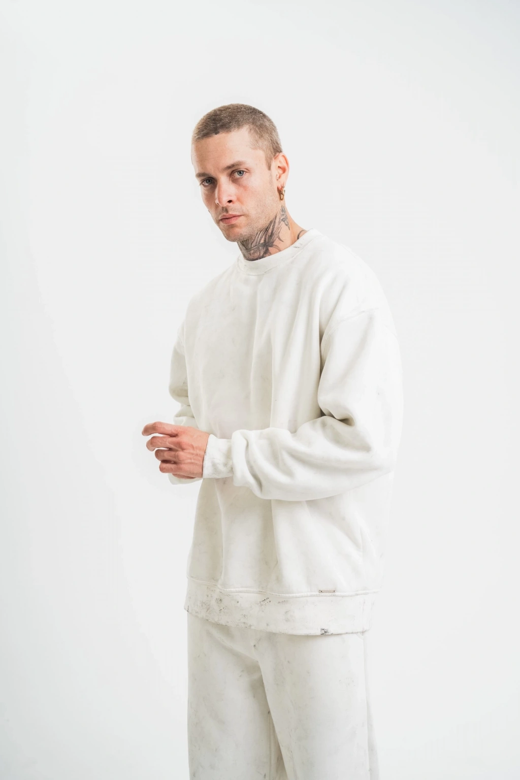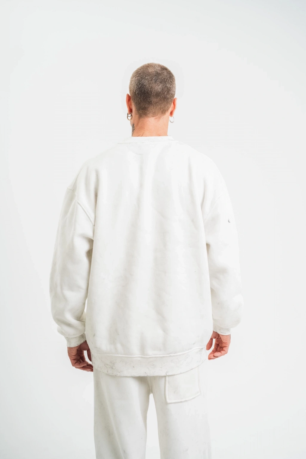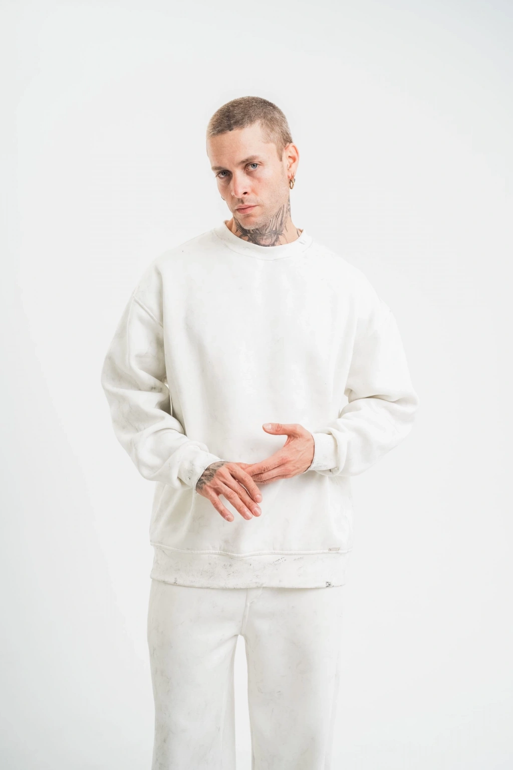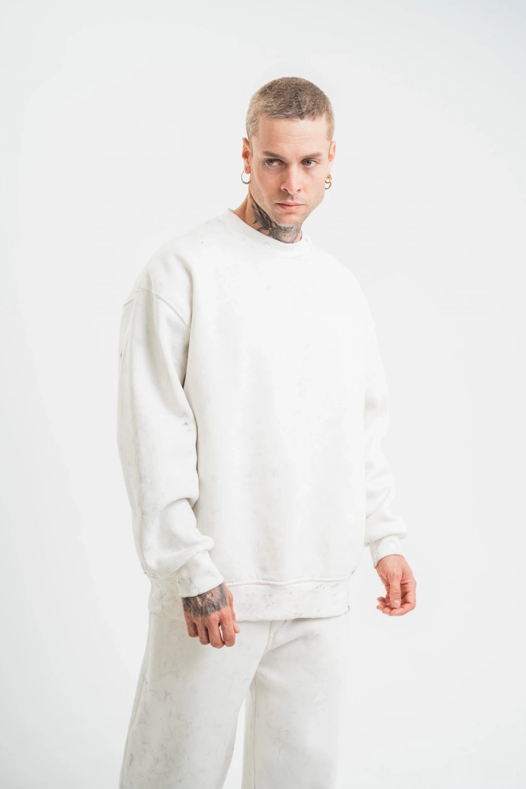 Erkek Oversize Üç İplik Kapüşonlu Sweat – Kol ve Etek Ribana Detaylı, Ön ve Sırt Baskılı, Kanguru Cepli Rahat Kalıp Model - Beyaz