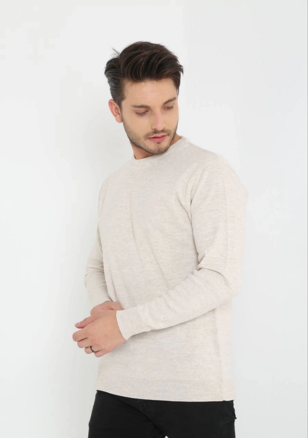 Unisex Uzun Kol Biskilet Yaka Dokuma Triko - Bej