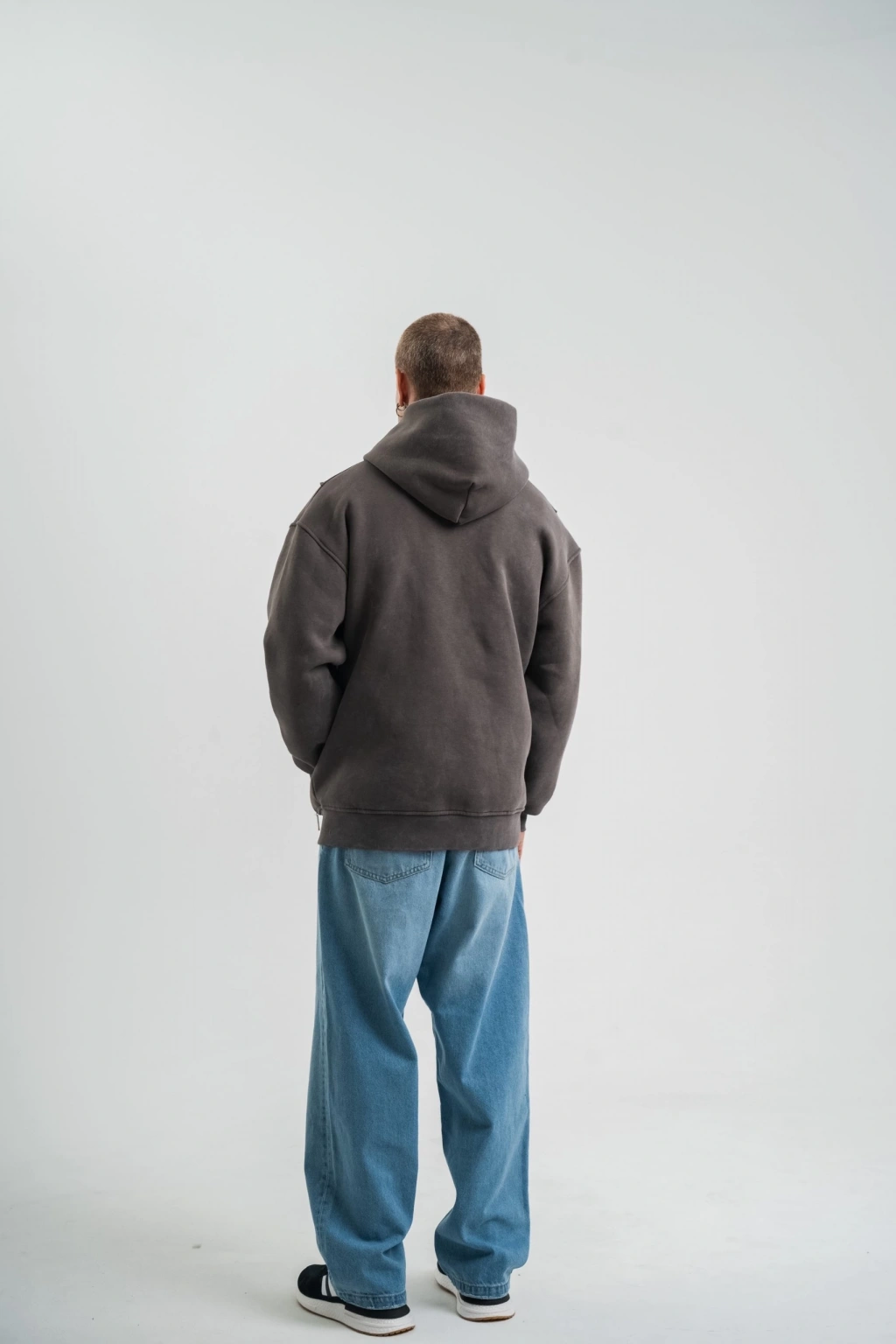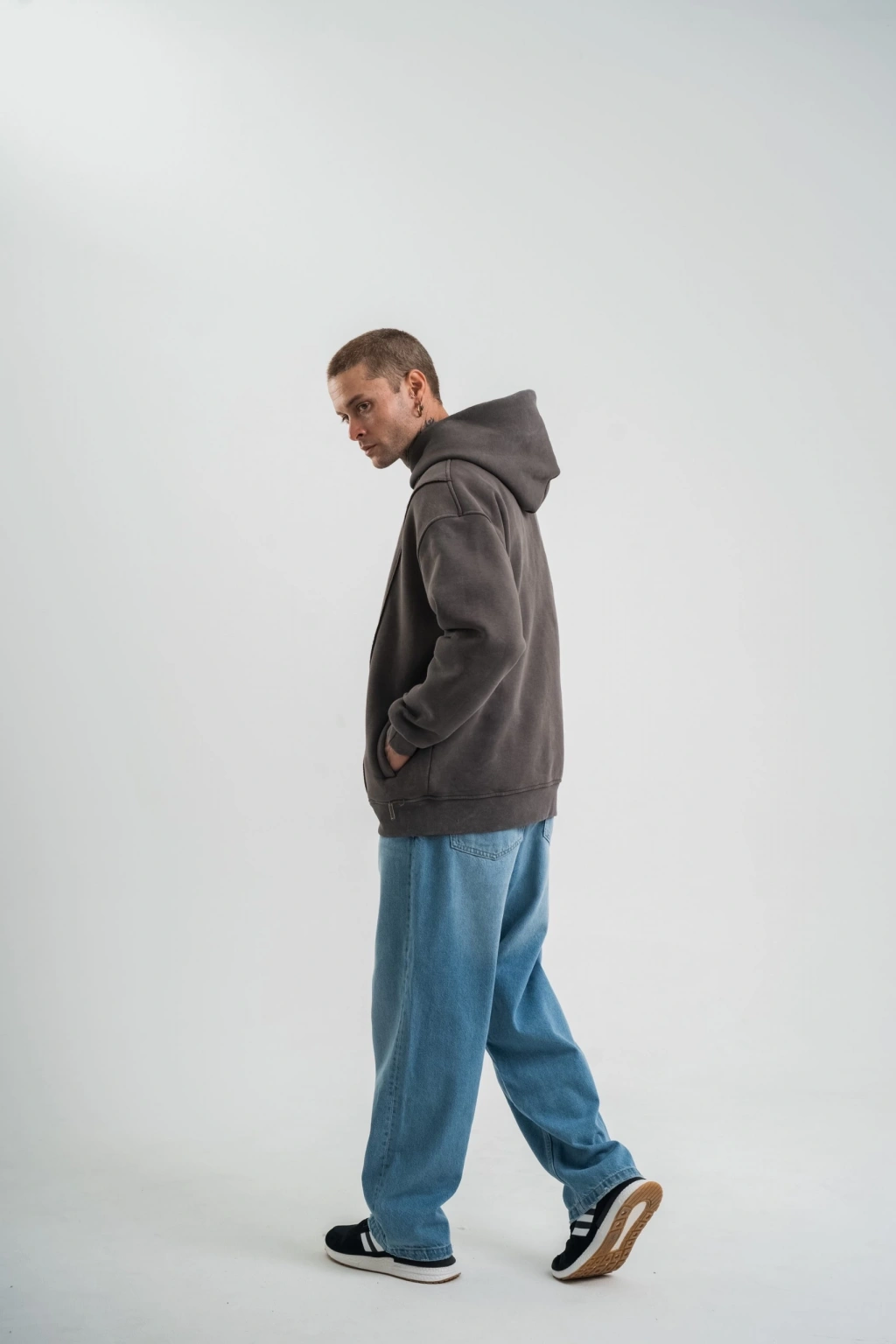 Erkek Oversize Üç İplik Kapüşonlu Sweat – Siyah Kol ve Etek Ribana Detaylı, Ön ve Sırt Baskılı, Kanguru Cepli Rahat Kalıp Model