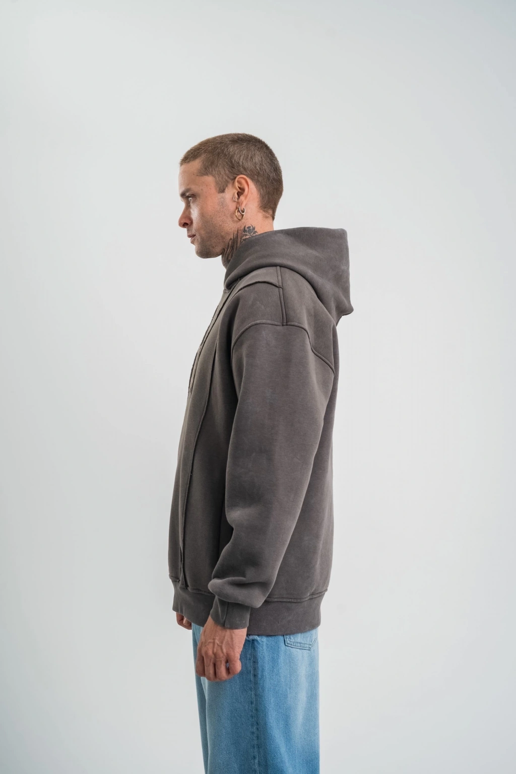 Erkek Ovarsize Kapüşonlu Swetshirt Kanguru Çepli Cıtcıtlı 3 iplik Şardonlu Hoodie - Haki