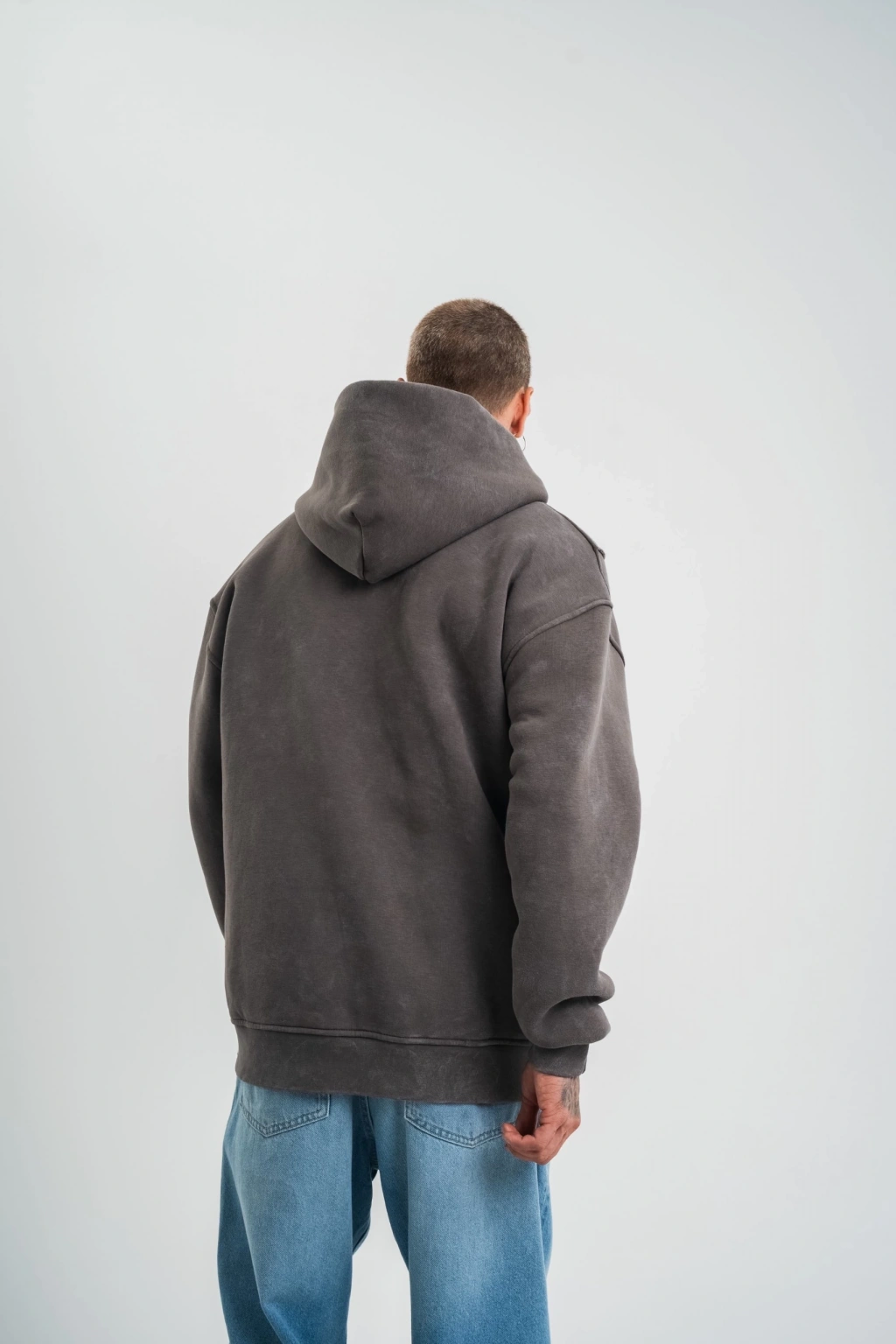 Erkek Oversize Üç İplik Kapüşonlu Sweatshirt – Siyah Sırt ve Ön Baskılı, Kanguru Cepli, Rahat Kalıp, İçi Pamuklu ModeL-Siyah
