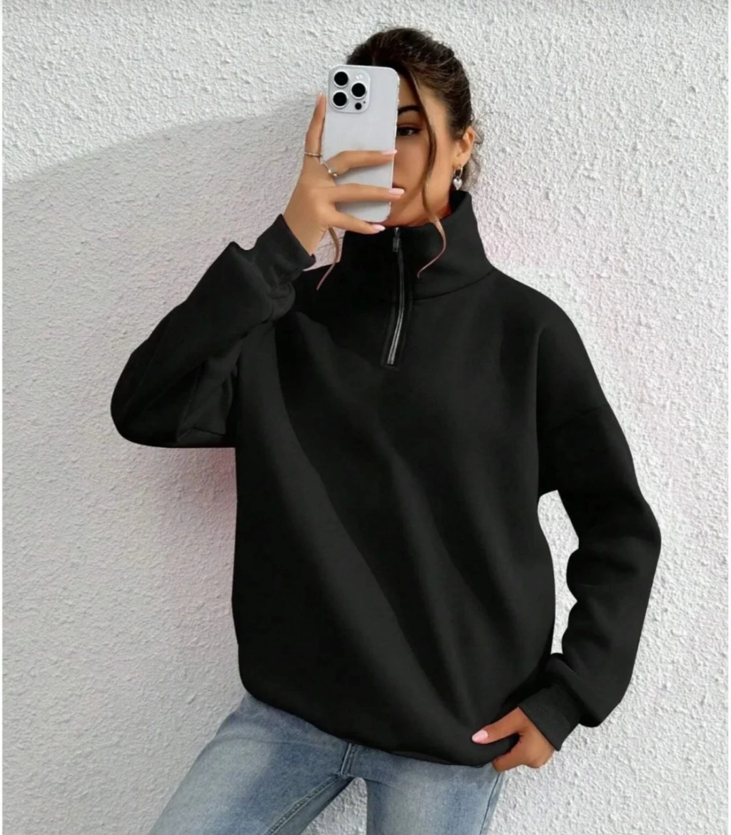 Kadın Üç İplik Dık Yaka Yarım Fermuarlı SweatShirt - Siyah