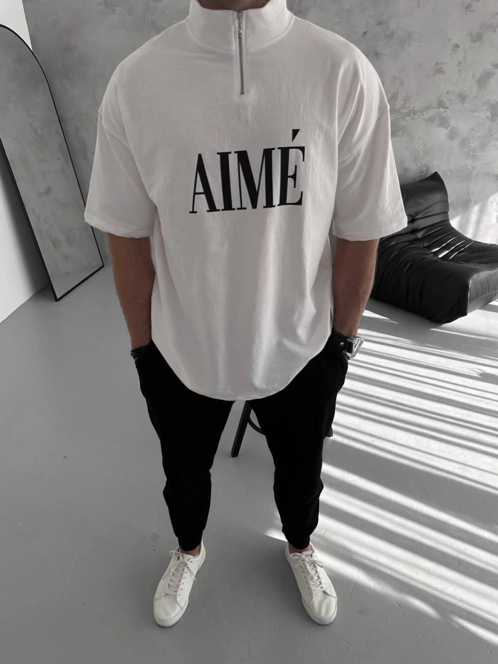 Unisex Yarım Fermuarlı Baskılı T-shirt - Beyaz