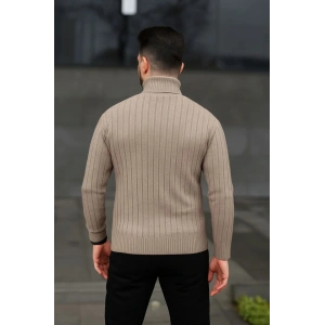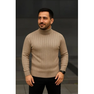 Erkek Fitilli Triko Kazak 2'li Set Bej Siyah Regular Balıkcı Yaka Tam Boğazlı Triko Seti Modeli Kazak