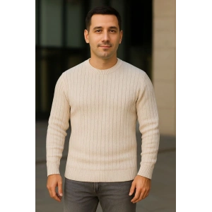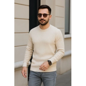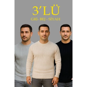 Erkek Fitilli Triko Kazak 3'lü Set Bej Gri Siyah Regular Fit Bisiklet Yaka Triko Seti Kazak Modeli