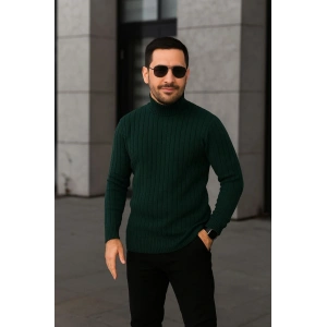Erkek Bisiklet Yuvarlak Yaka Triko Kazak Pamuklu Kalın Fitilli Dokuma, Regular Fit Uzun Kollu Kışlık Model - Mint Yeşili