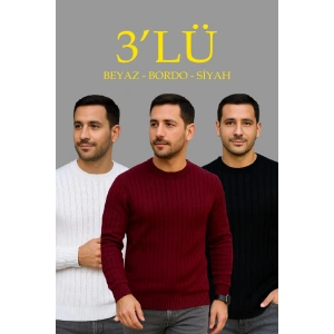 Erkek Fitilli Triko Kazak 3'lü Set Beyaz Bordo Siyah Regular Fit Bisiklet Yaka Triko Seti