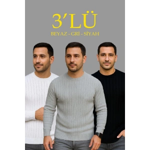 Erkek Fitilli Triko Kazak 3'lü Set Beyaz Gri Siyah Regular Fit Bisiklet Yaka Triko Seti Kazak Modeli