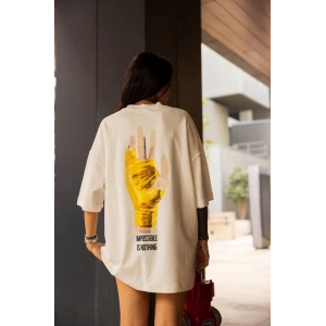 Unisex Bisiklet Yaka Baskılı Oversize T-Shirt - Bej