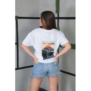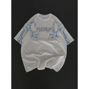 Unisex Bisiklet Yaka Baskılı Oversize T-Shirt- Beyaz