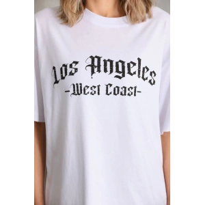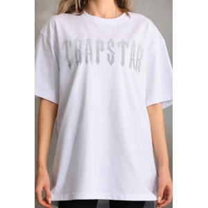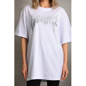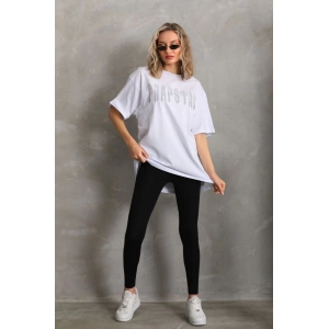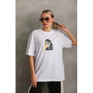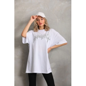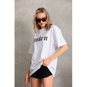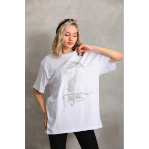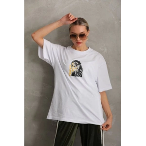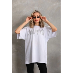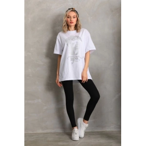 Unisex Taş Desenli Oversize T-Shirt - Beyaz