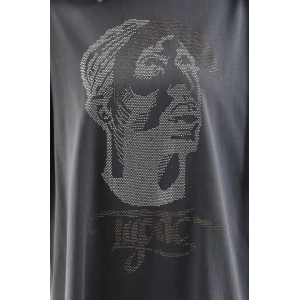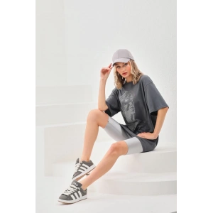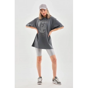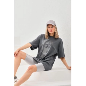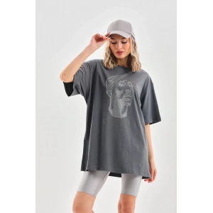Unisex Taş Desenli Oversize T-Shirt - Füme